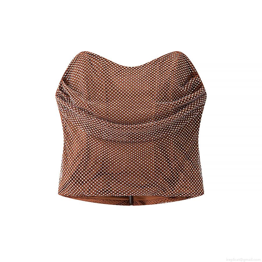 • Women Sexy Brown Rhinestone Mesh Two Piece Set Strapless Tube Top And Bodycon Mini Skirt Outfits Luxury Sparkling Metallic Clubwear Party Sets