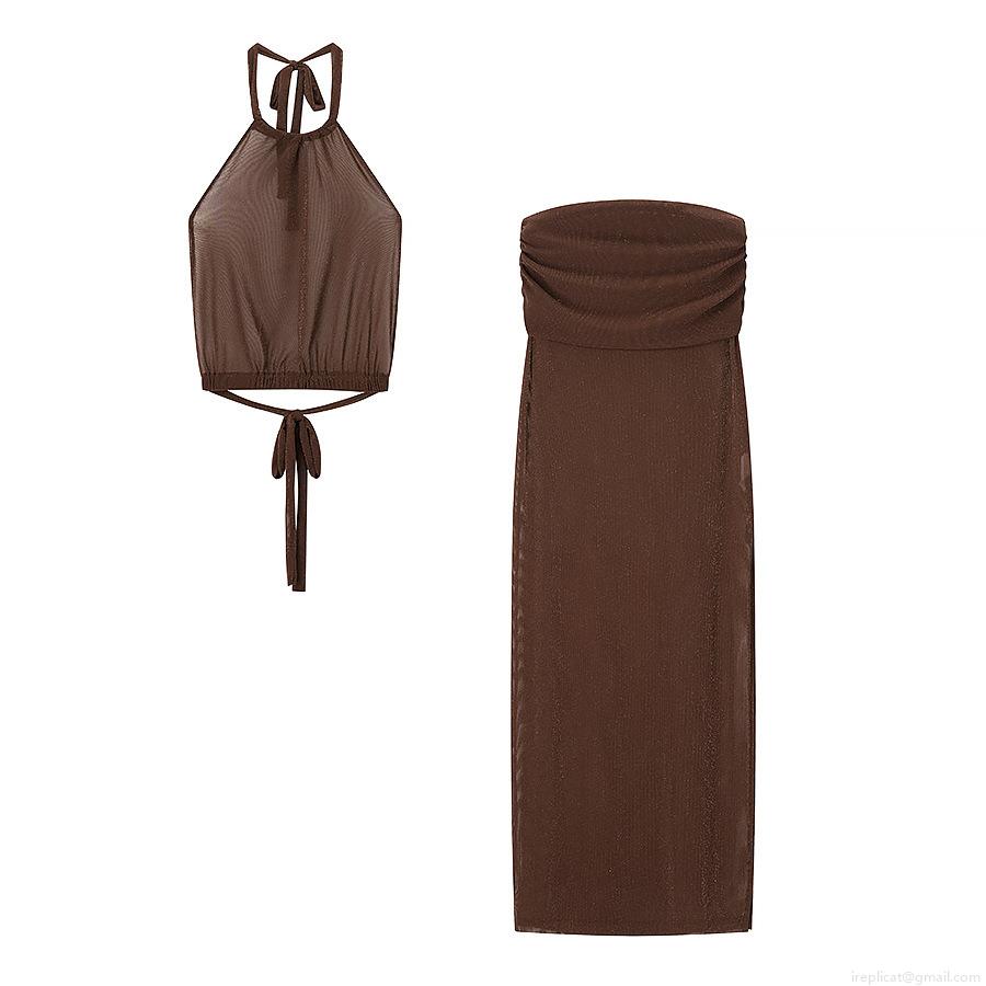 • Women Sexy Halter Crop Top And Side Slit Maxi Skirt Two Piece Set Glitter Metallic Knitted Outfits For Summer Vacation Club Party Streetwear