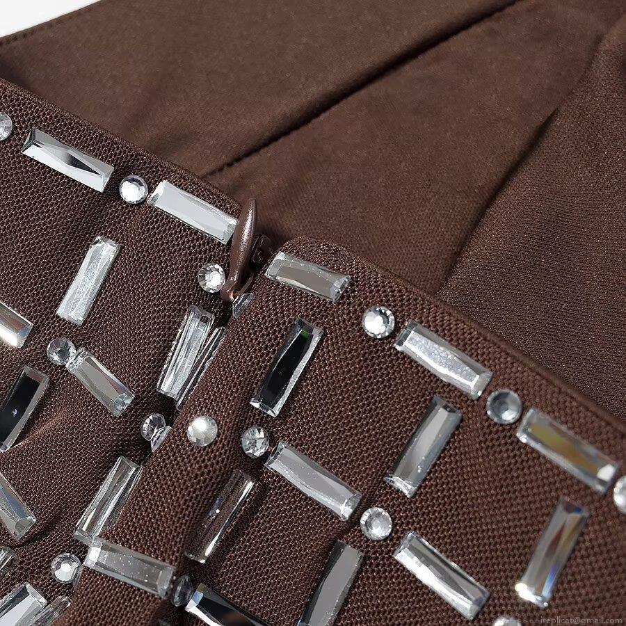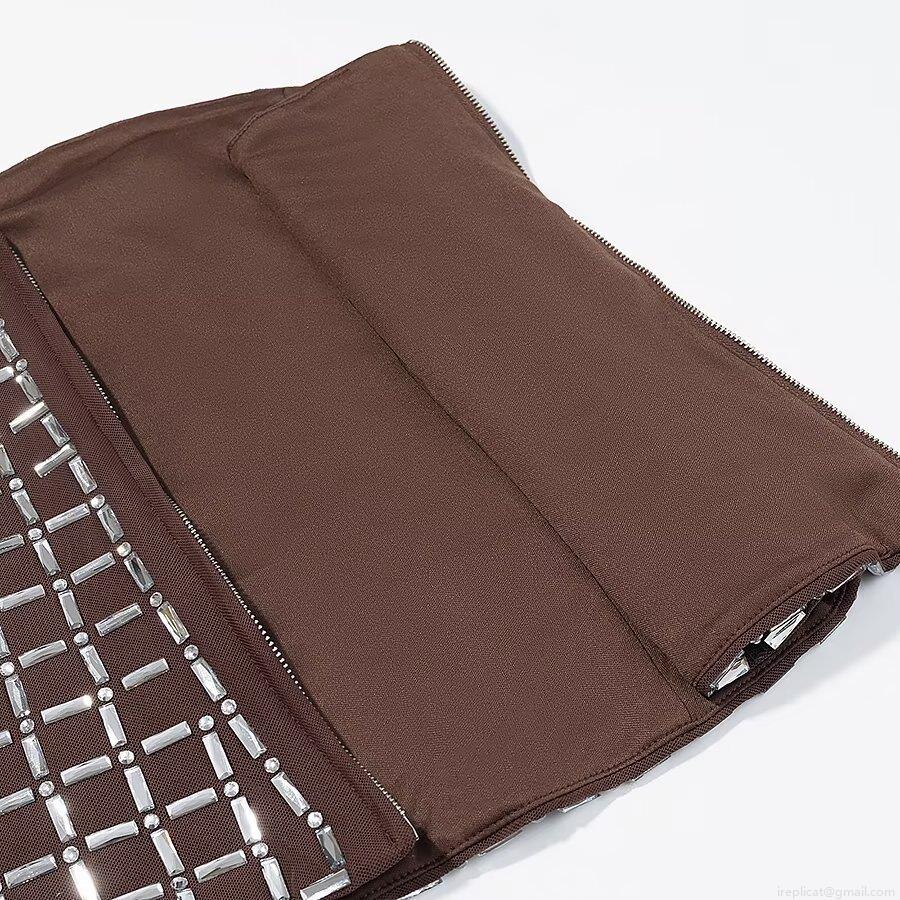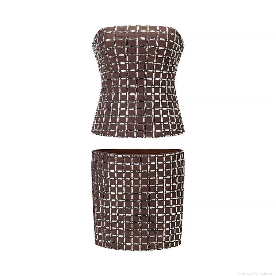 Women Sexy Hot Girl Two-Piece Skirt Set Rhinestone Grid Mesh Tube Top and Mini Hip Skirt Bodycon Nightclub Party Outfits Dark Brown Polyester