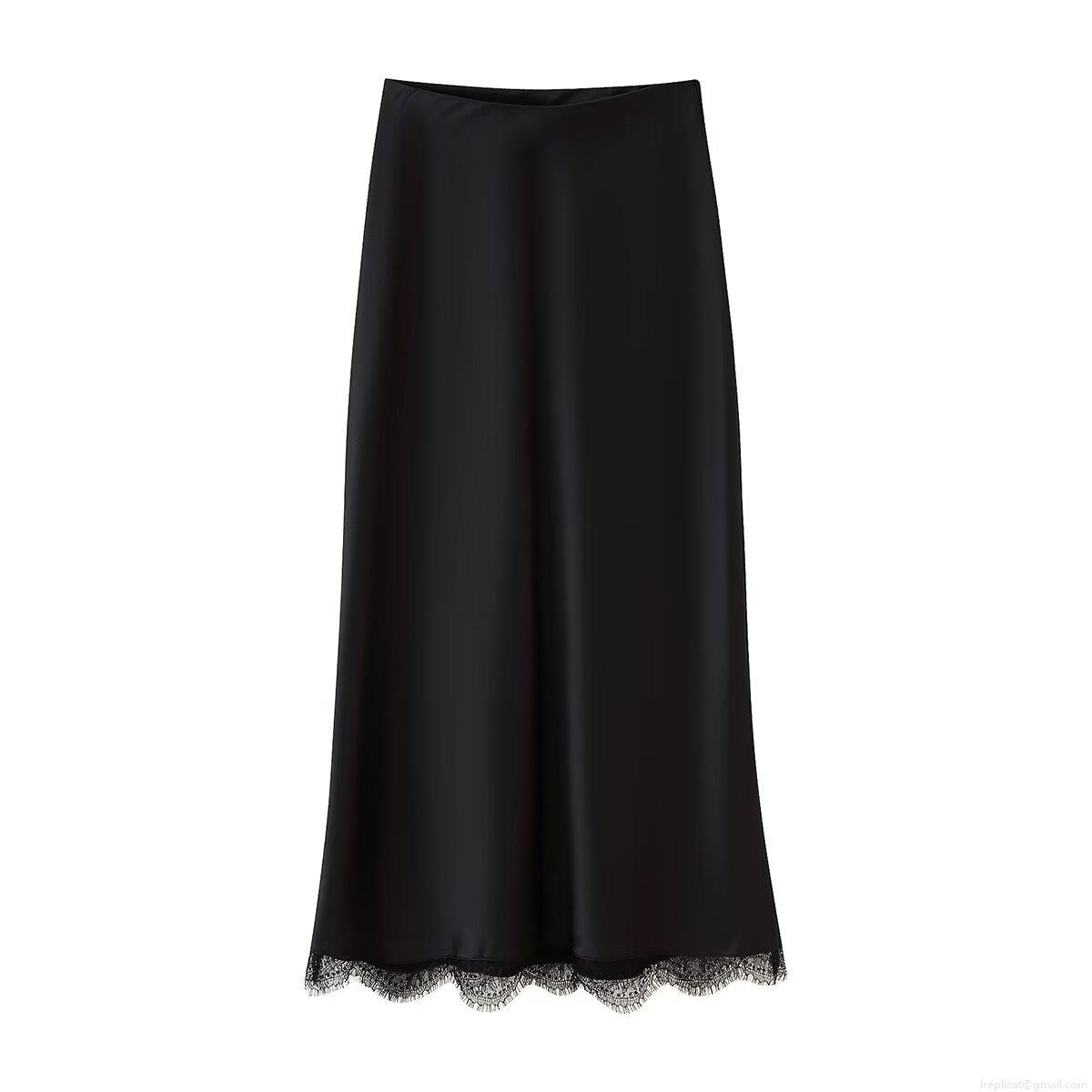 Women Sexy Lace Satin Two Piece Set V-Neck Camisole Top and Lace Trim Midi Skirt Black Silk Like Streetwear Summer Casual Outfit