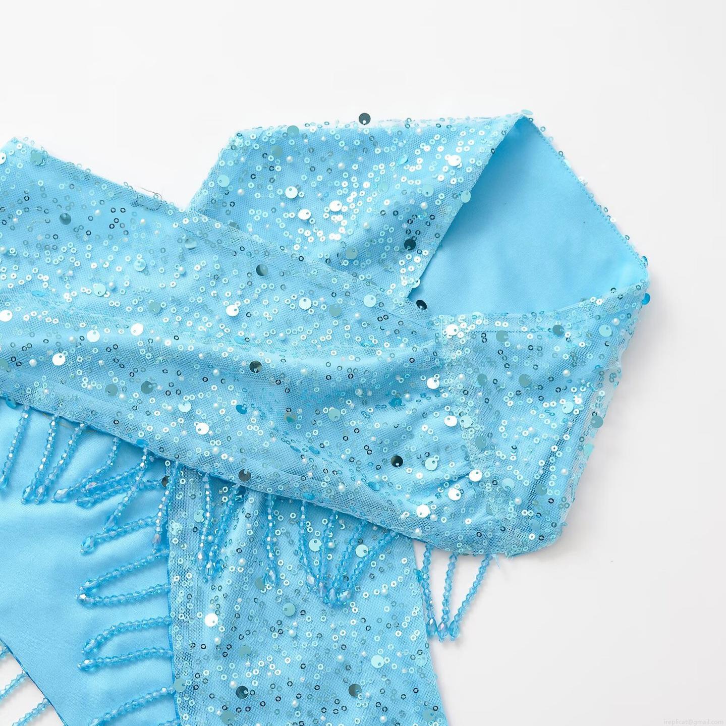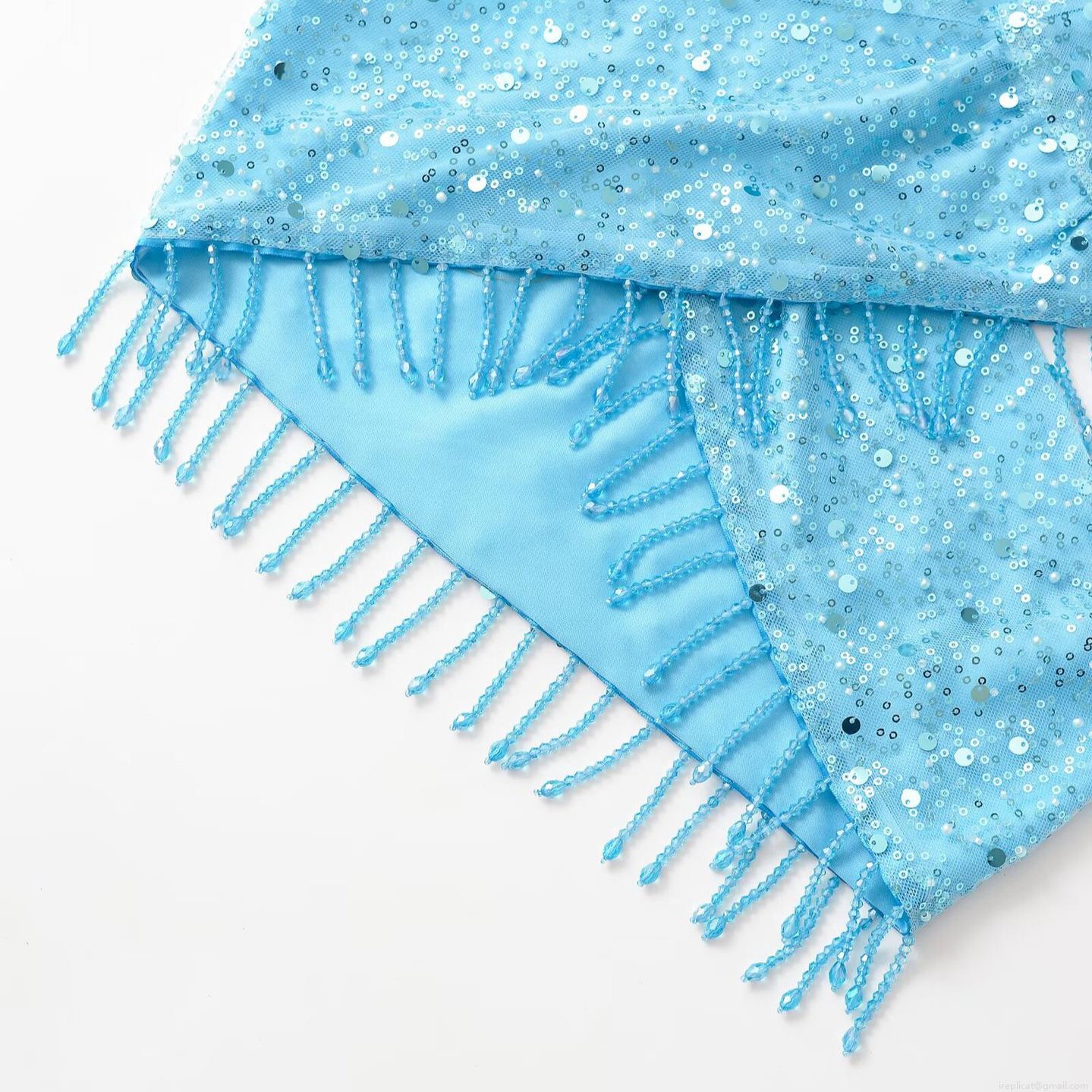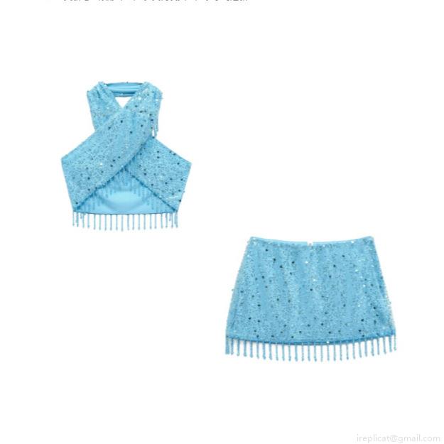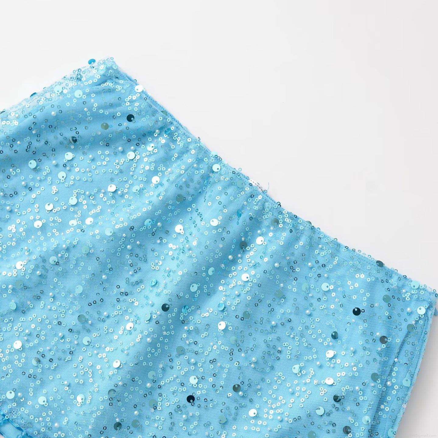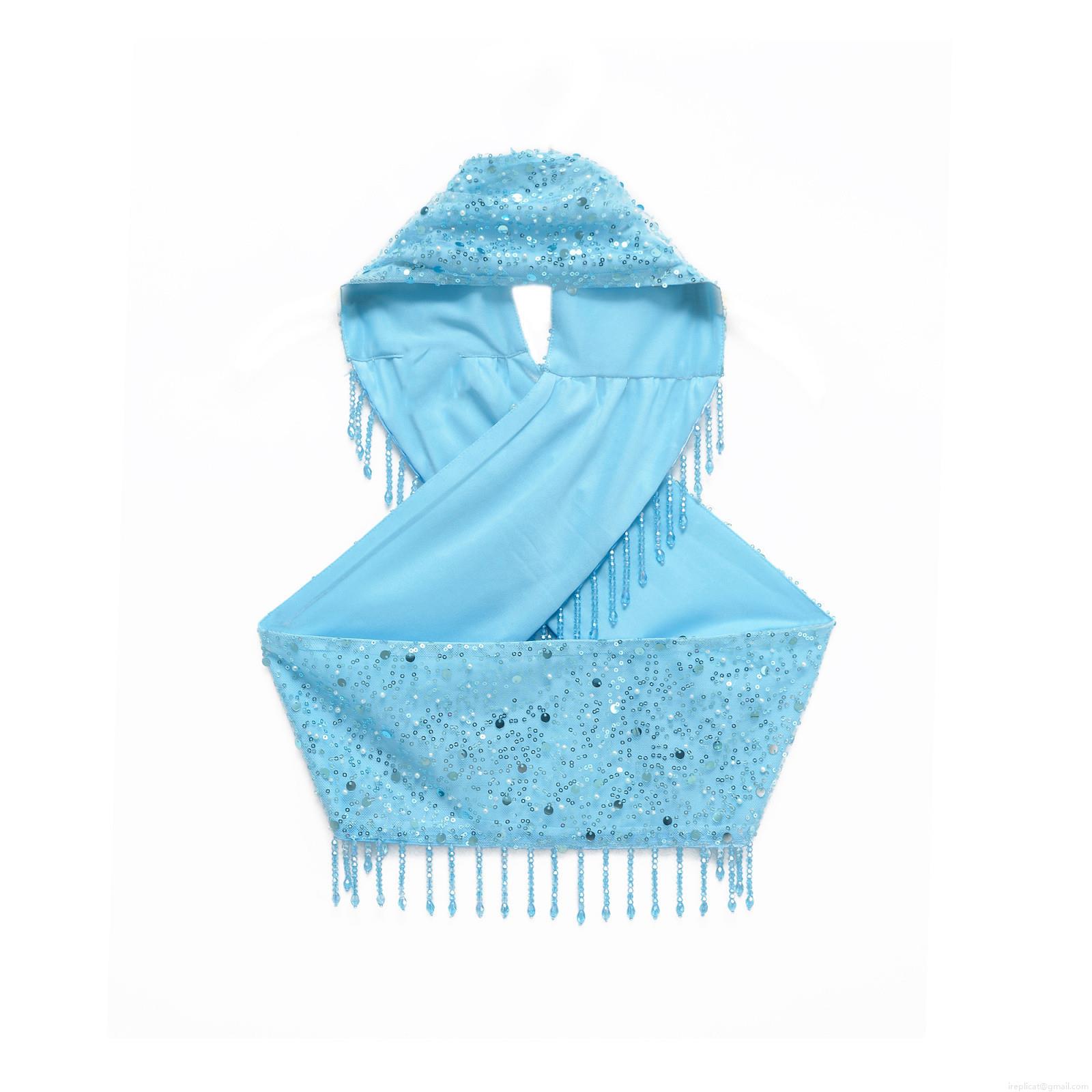 • Women Sexy Light Blue Sequin Tassel Two Piece Set Halter Neck Crop Top And Mini Skirt Suit Beaded Pearl Glamorous Party Clubwear Outfits