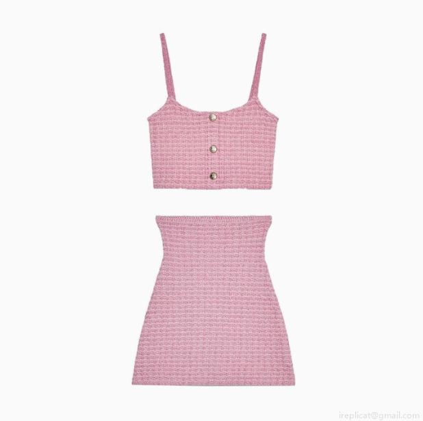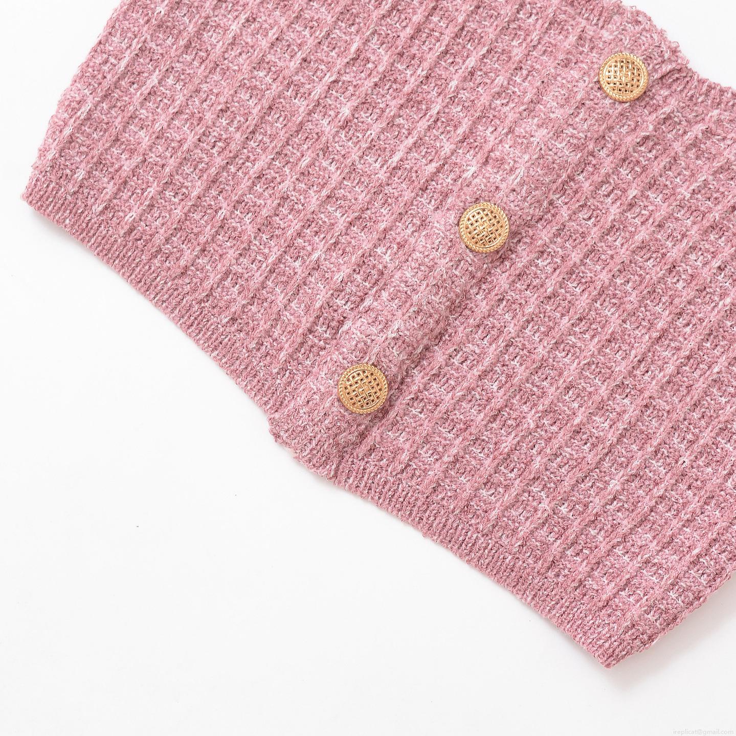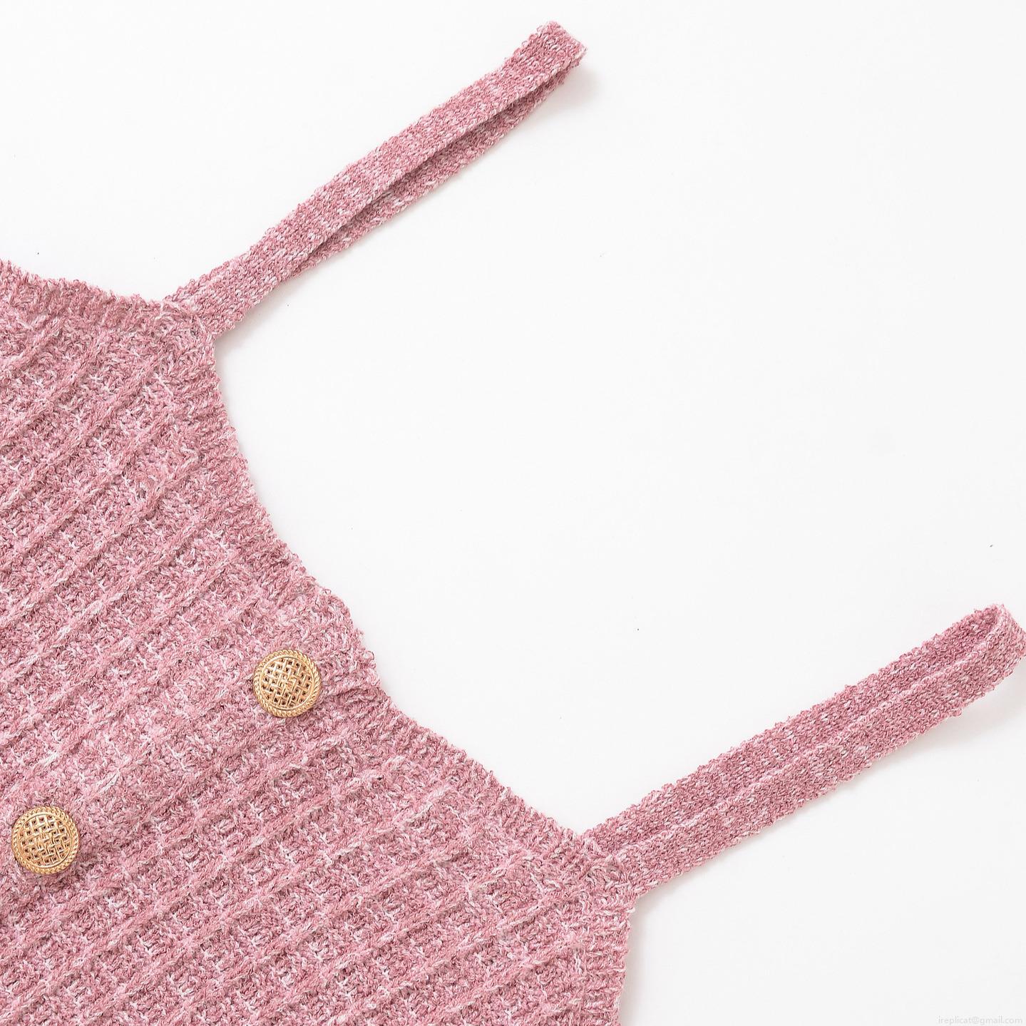 • Women Sexy Pink Knitted Two Piece Set Waffle Knit Gold Button Cami Crop Top And High Waist Bodycon Midi Skirt Outfits For Summer Vacation Party Clubwear
