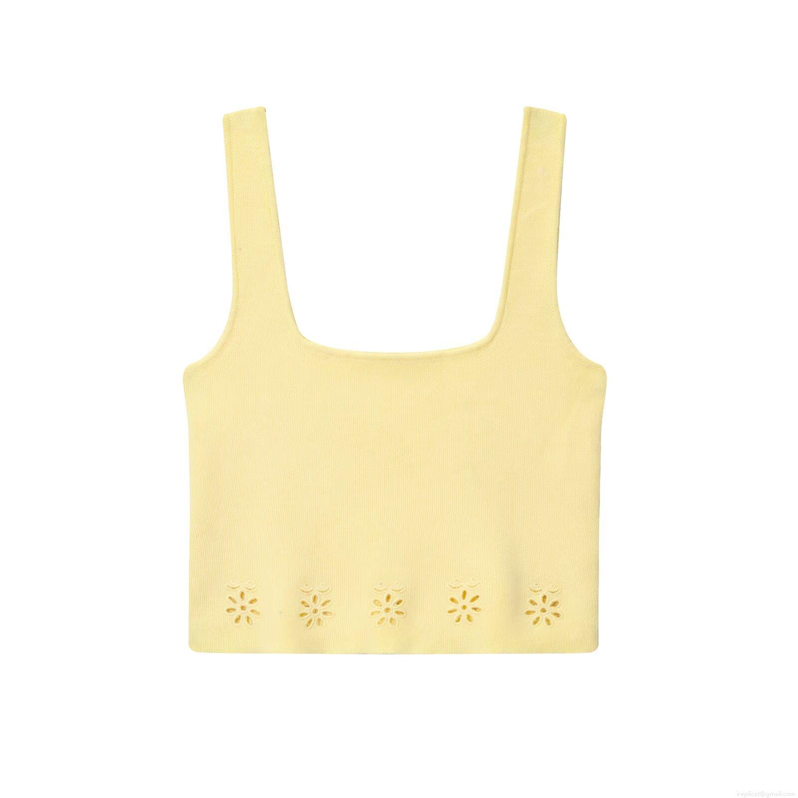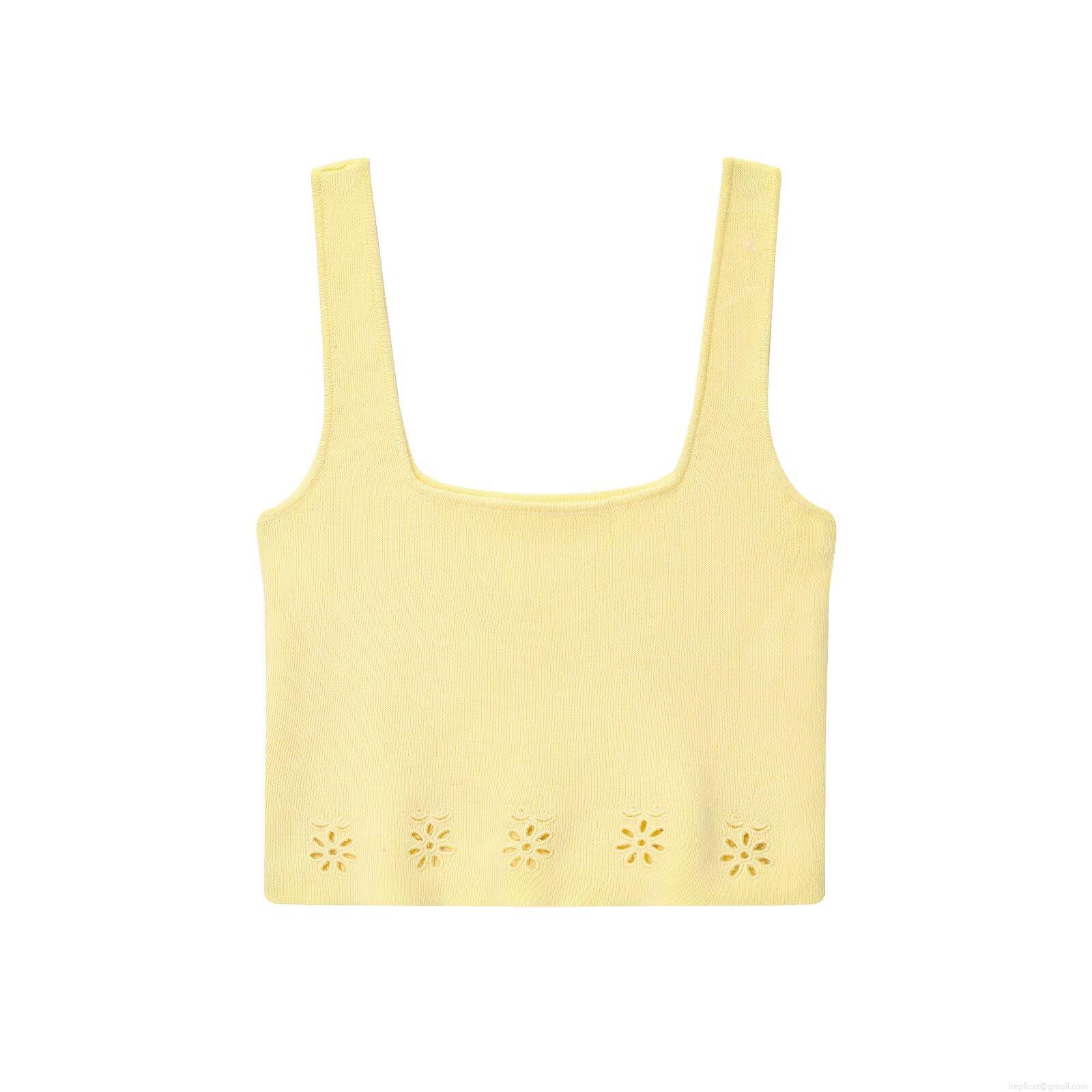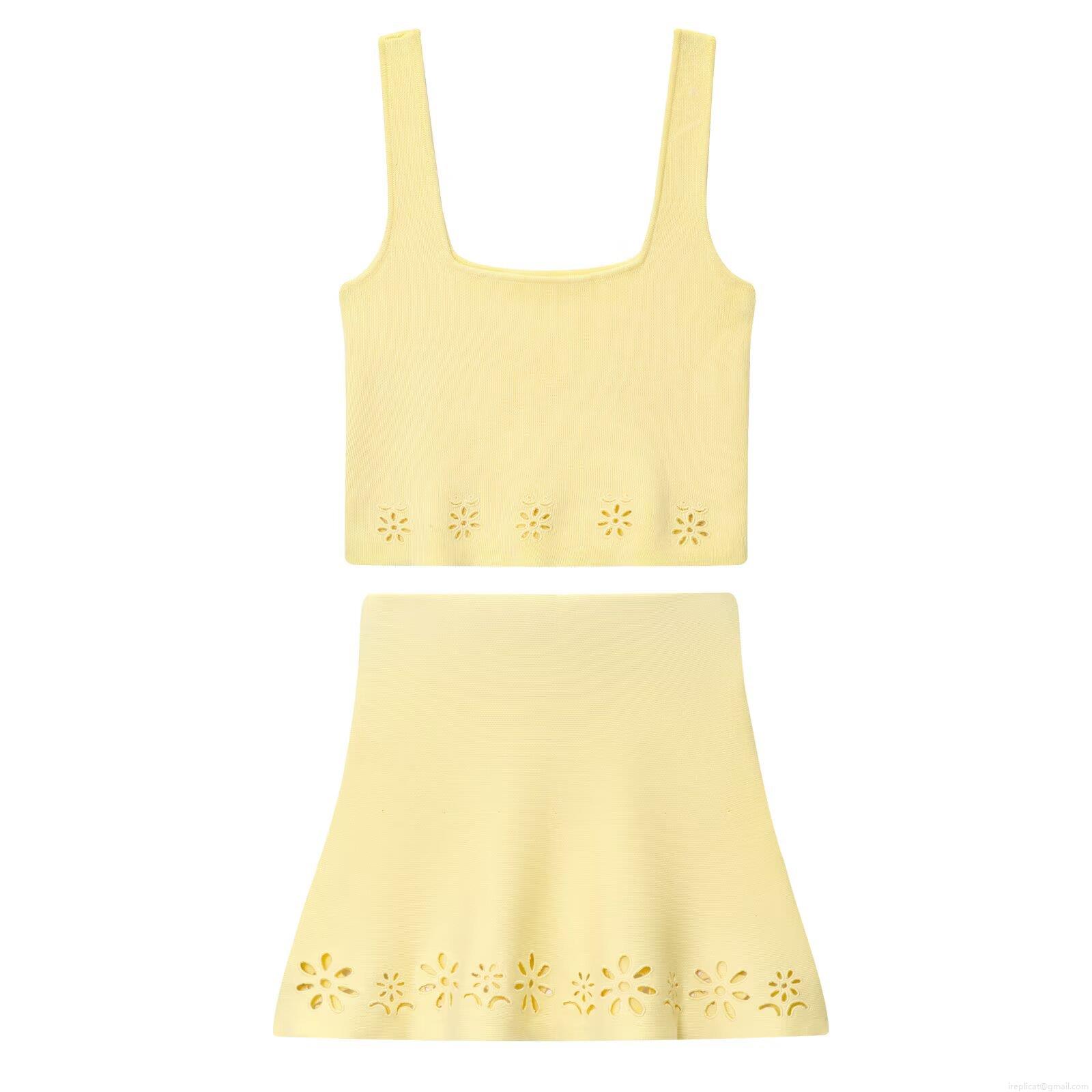 • Women Summer Knit Two Piece Set Embroidered Square Neck Camisole And Mini A-Line Skirt Hollow Out Flower Design Casual Streetwear Outfits Yellow