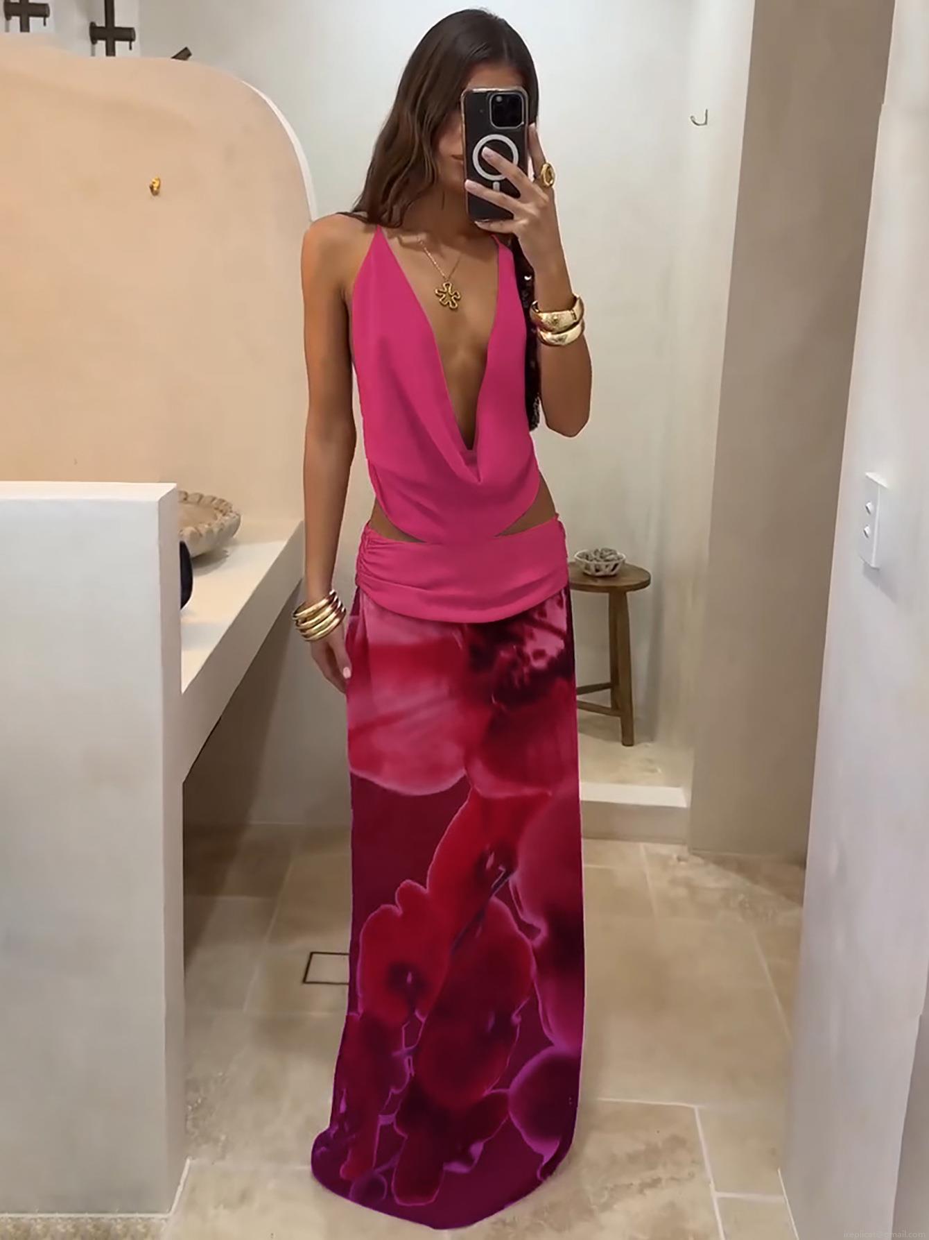 • Women Summer Sexy Floral Print Two Piece Skirt Set Backless Halter Cowl Neck Mesh Top And Maxi Skirt Beach Party Outfits