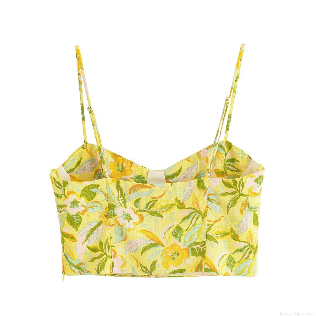 Floral Pattern, Flowers, Printing, Navel Exposed, Button, Thin Shoulder Straps