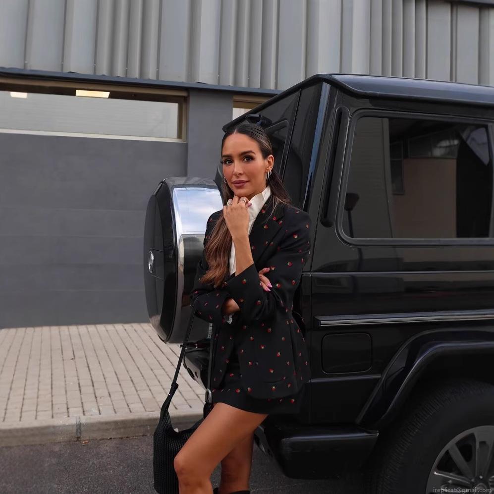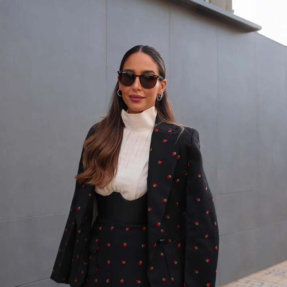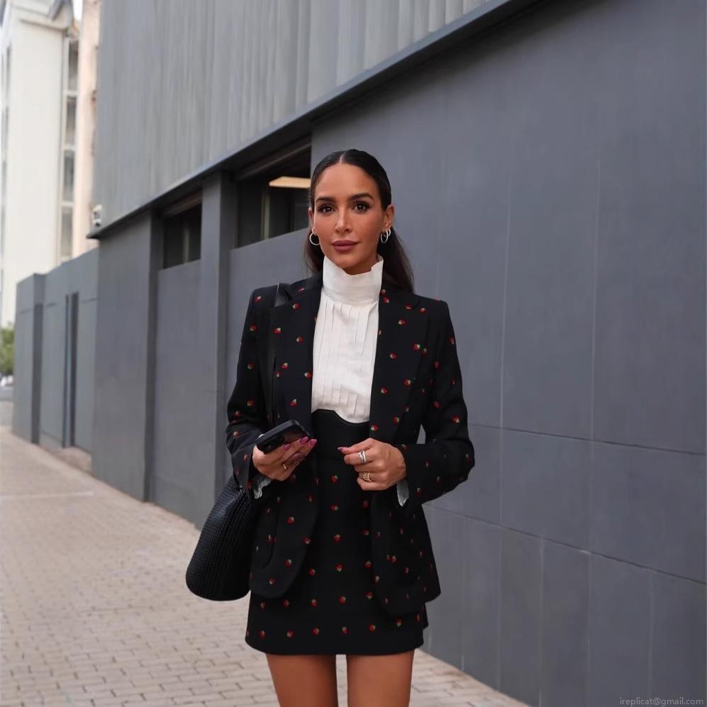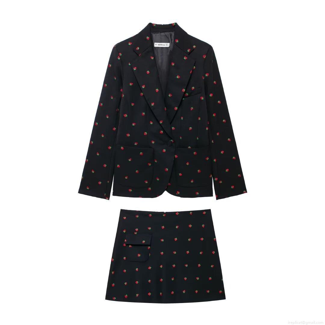 • Women Sweet Strawberry Embroidery Skirt Suit Set Single Breasted Blazer Jacket And A-Line Mini Skirt Two Piece Outfits For Party Streetwear Casual Autumn Fashion Polyester Black