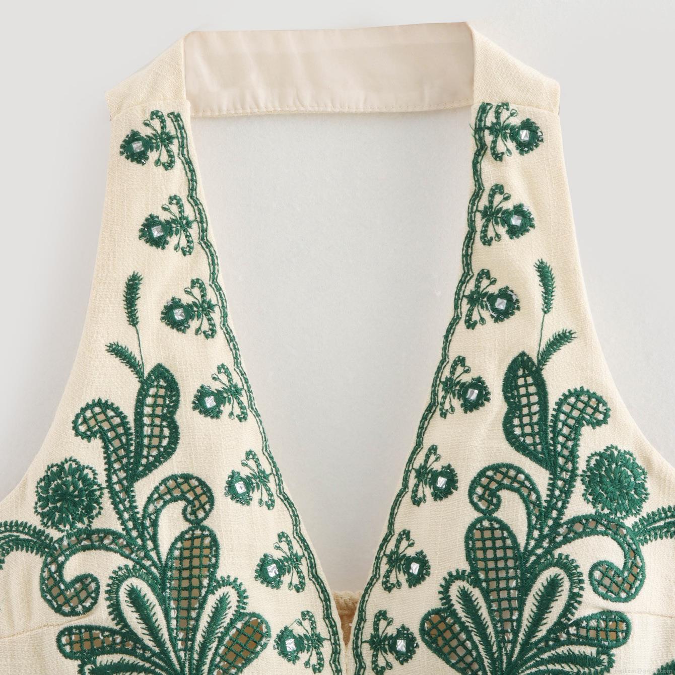 • Women Vintage Floral Embroidery Halter Neck Crop Top and A-Line Mini Skirt Set Elegant Sweet Spicy Style Backless Sequin Hollow Out Summer Party Outfits