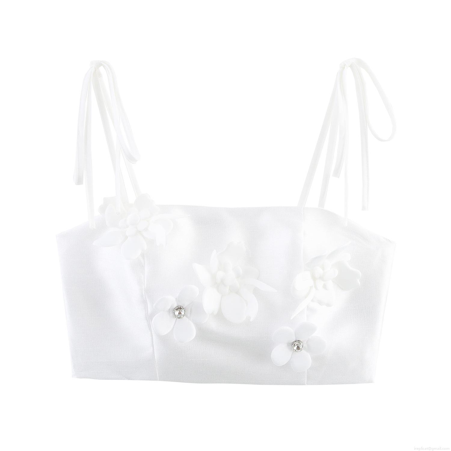 • Women White 2 Piece Skirt Set Stereo Flower Rhinestone Tie Strap Crop Top And Tiered Maxi Skirt Elegant Sweet Summer Outfits