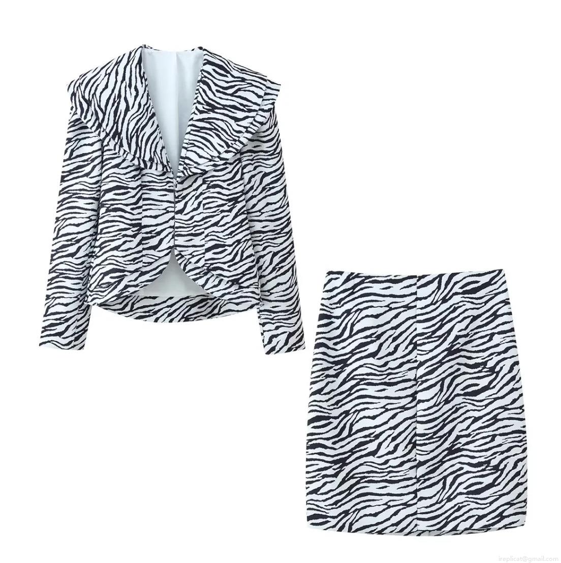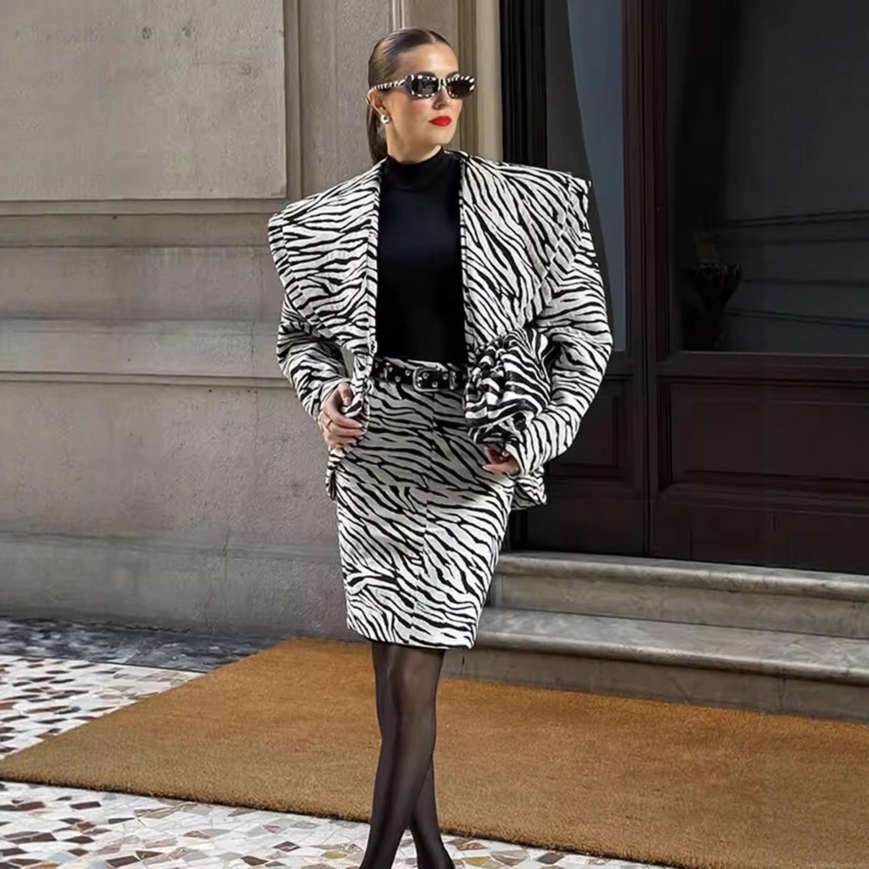 Women Zebra Print Blazer Jacket And Mini Skirt Two Piece Set Fashion Oversized Lapel Long Sleeve Suit For Streetwear Casual Office Party Lady