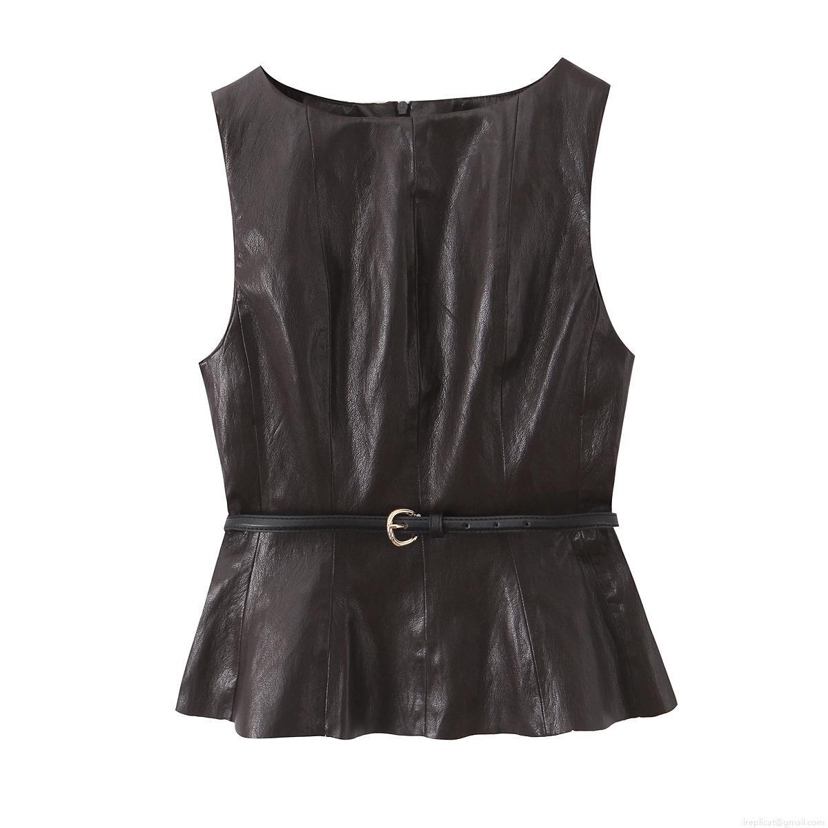 Women's 2 Piece Faux Leather Peplum Skirt Set Sleeveless Waist Belted Top And Front Split Midi Skirt Elegant Dark Brown Streetwear Party Outfits