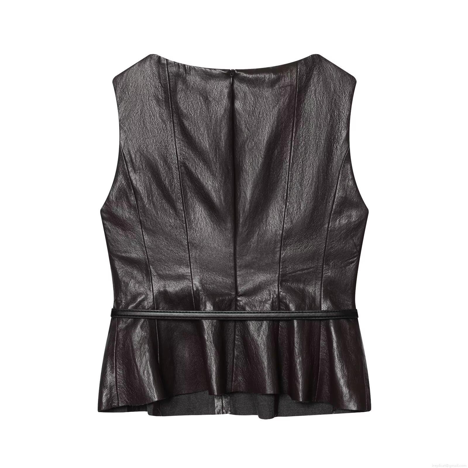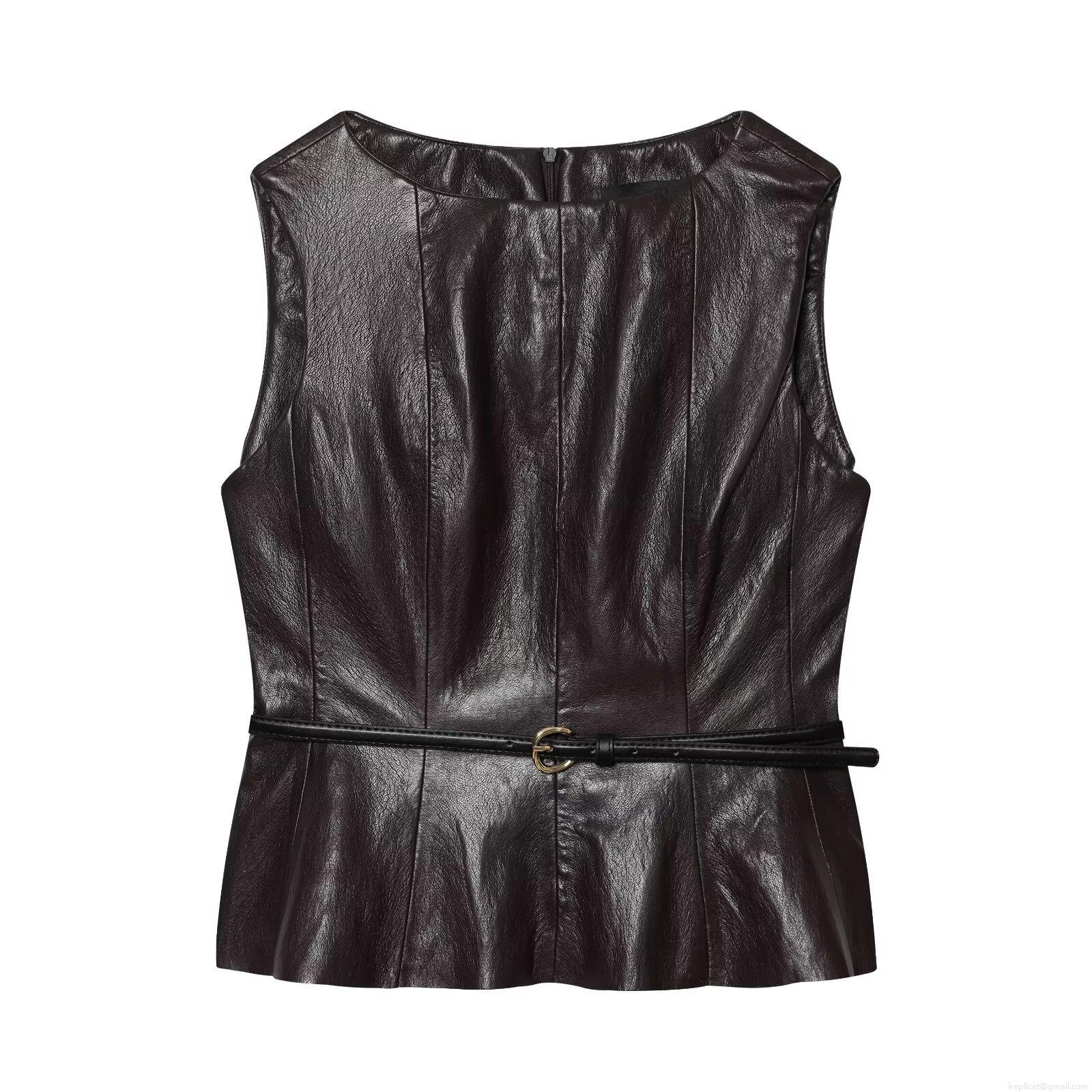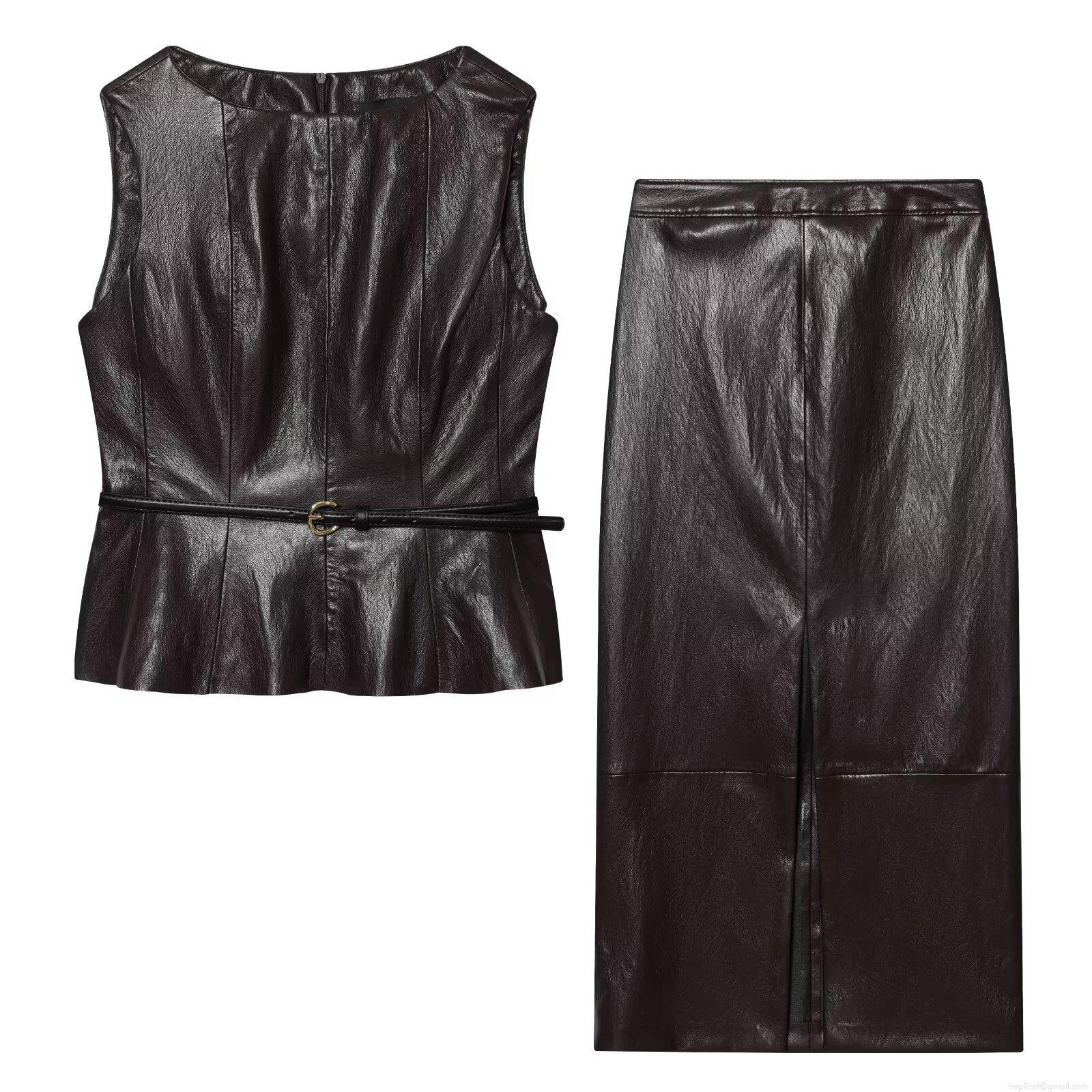 • Women's 2 Piece Faux Leather Peplum Top and Split Skirt Set With Belt Sleeveless Round Neck PU Leather Pencil Skirt Set for Party Streetwear