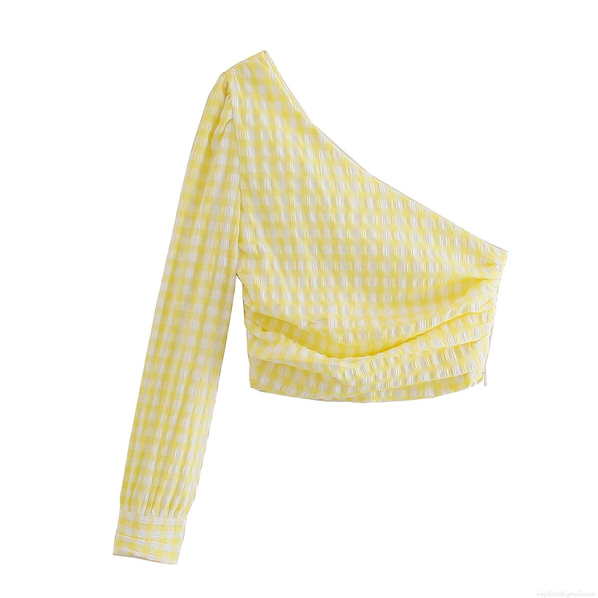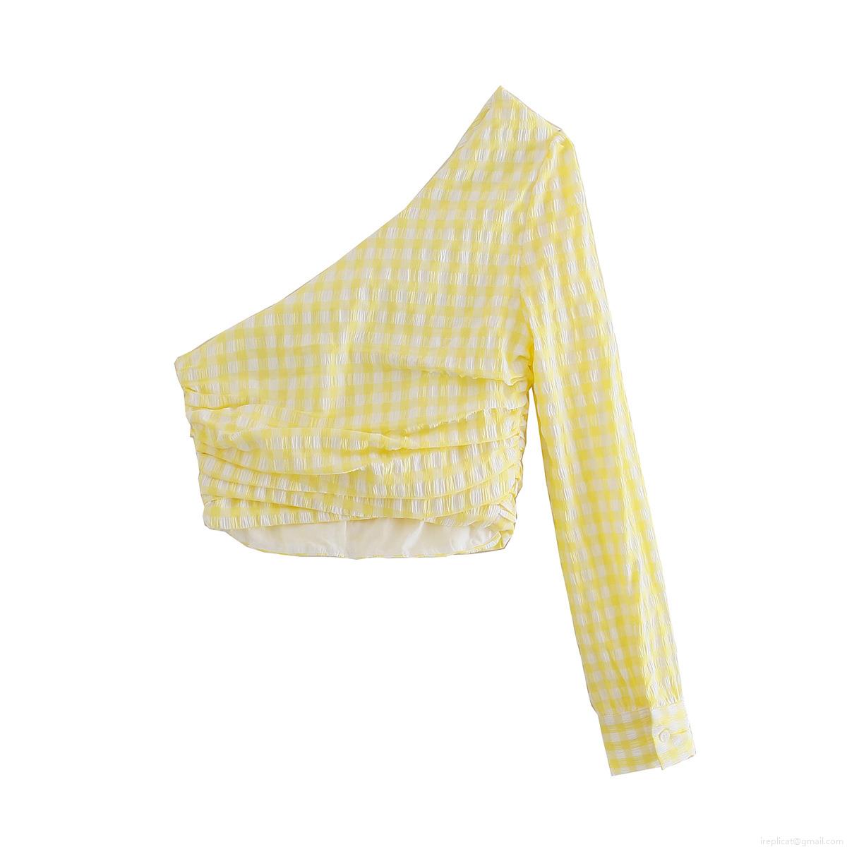 Checkered Pattern, Ruffles, Gathering, Puff Sleeves, One-shoulder Design, Seersucker Texture