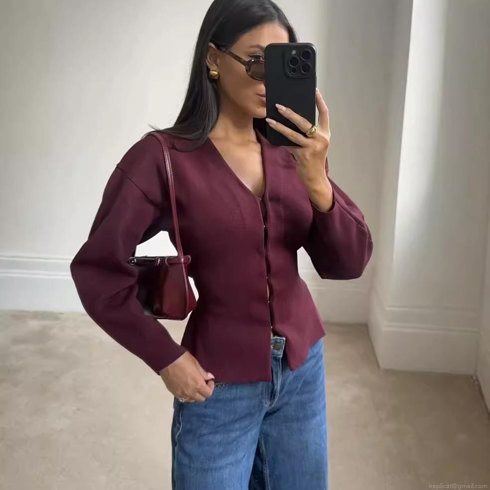 Solid Color, Waist shaping, V-neck, Button, Knitted Texture