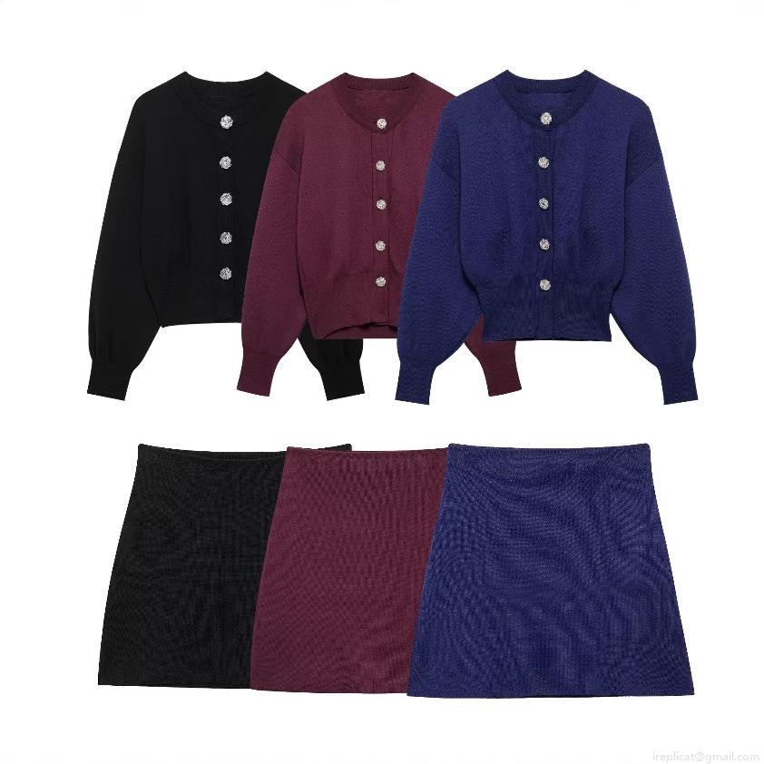 Women's 2 Piece Knit Outfits Solid Color 100% Polyester Long Sleeve Button Up Cardigan Sweater Top And High Waist Mini A-Line Skirt Set Elegant Streetwear For Spring