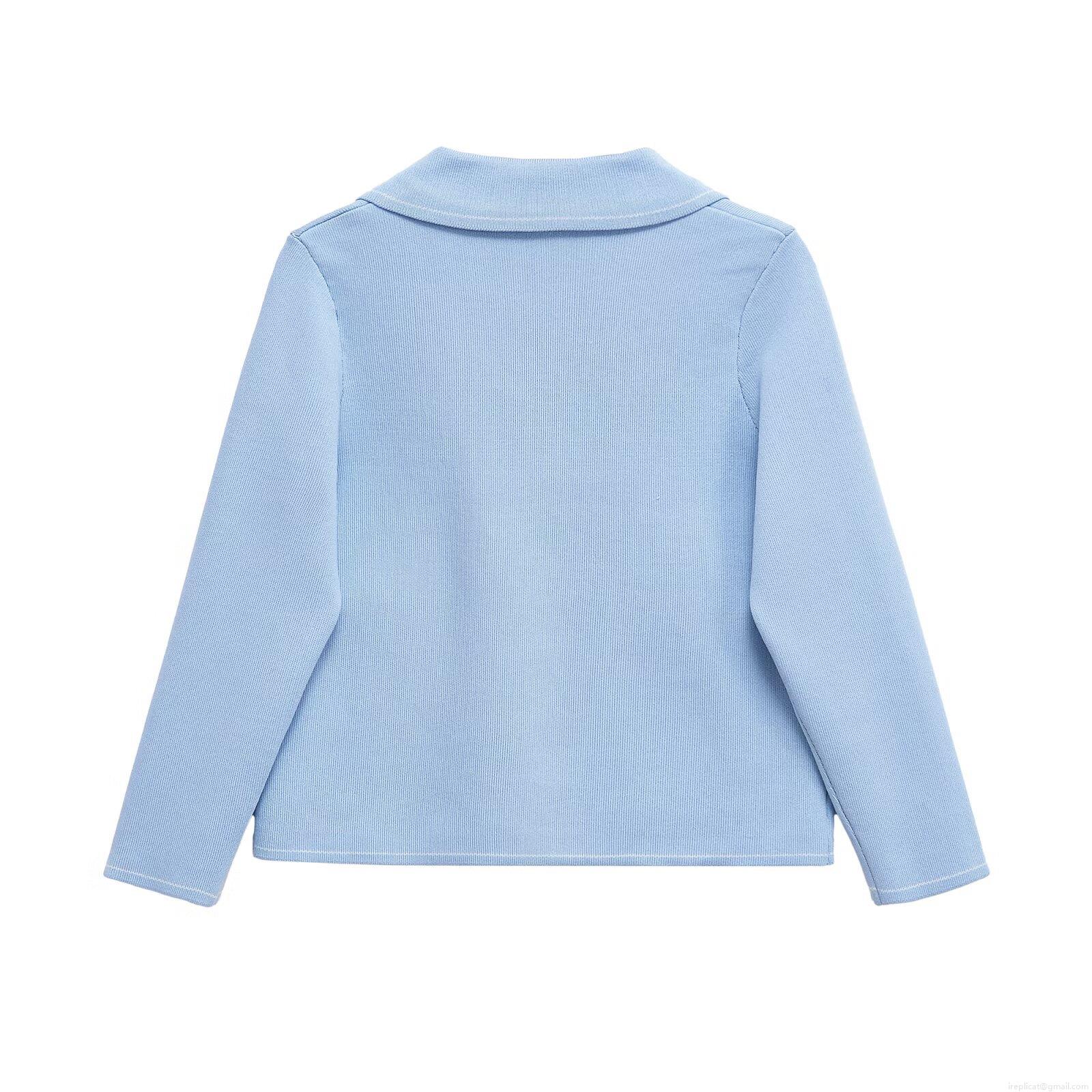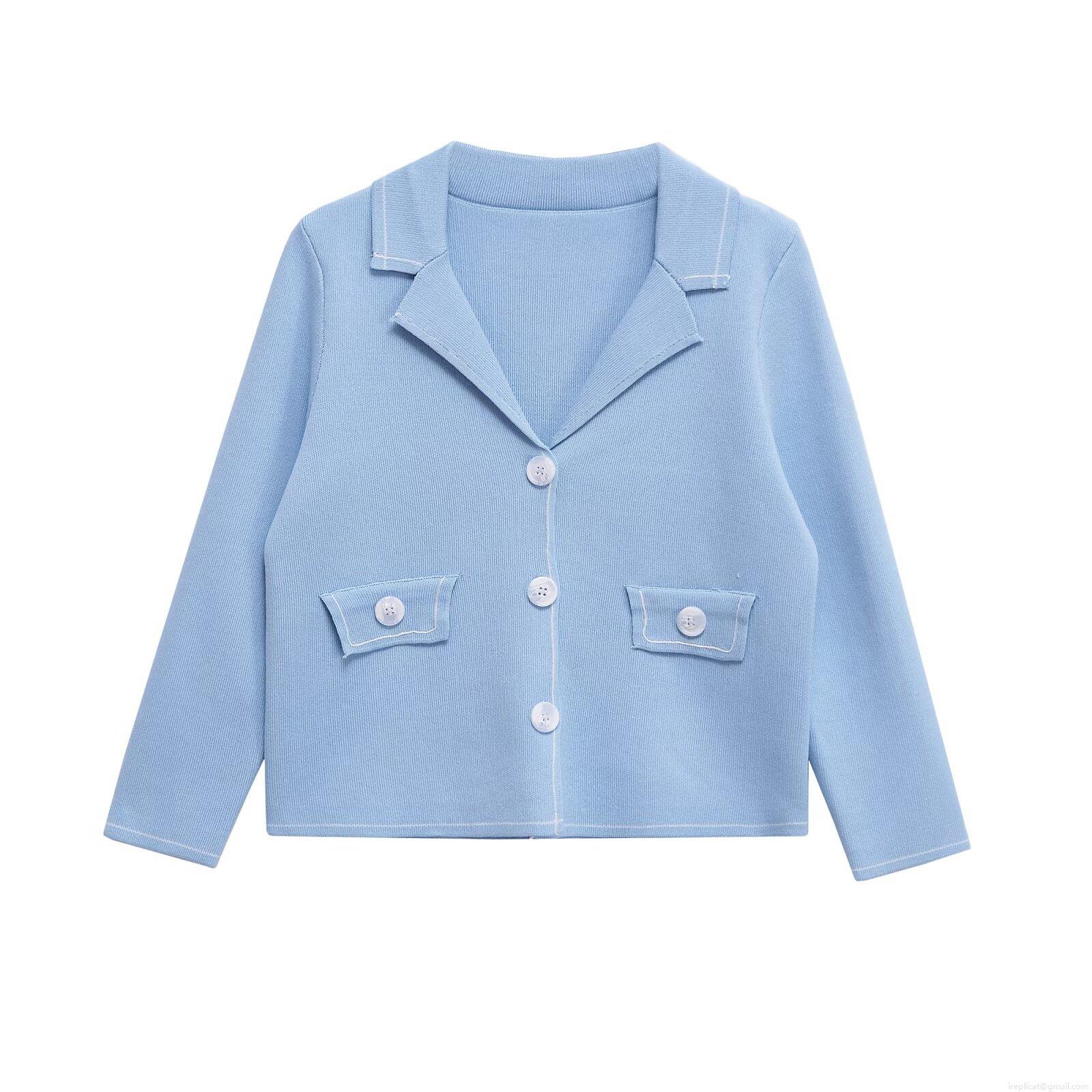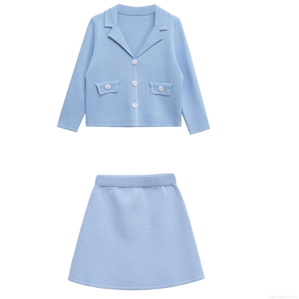 • Women's 2 Piece Knit Set Sky Blue Lapel Button Up Cardigan Jacket And A-Line Mini Skirt With Contrast Stitching Pockets Casual Autumn Streetwear Outfit