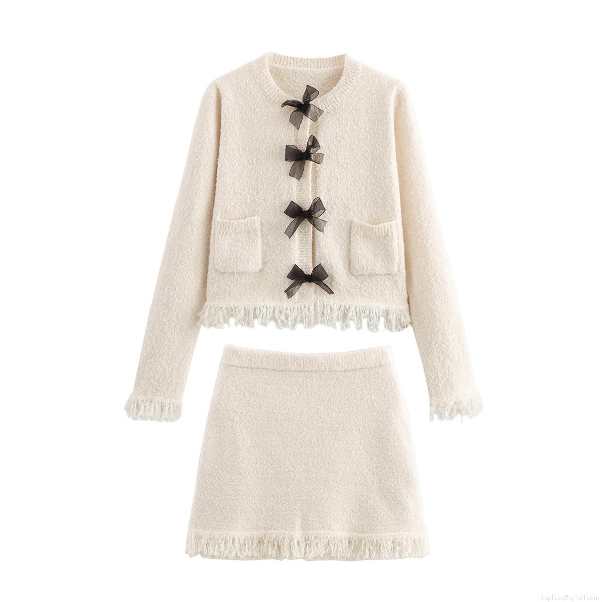 • Women's 2 Piece Knit Skirt Set Cream Long Sleeve Round Neck Cardigan With Black Bow Knots And Fringe Mini Skirt Casual Chic Outfit For Women