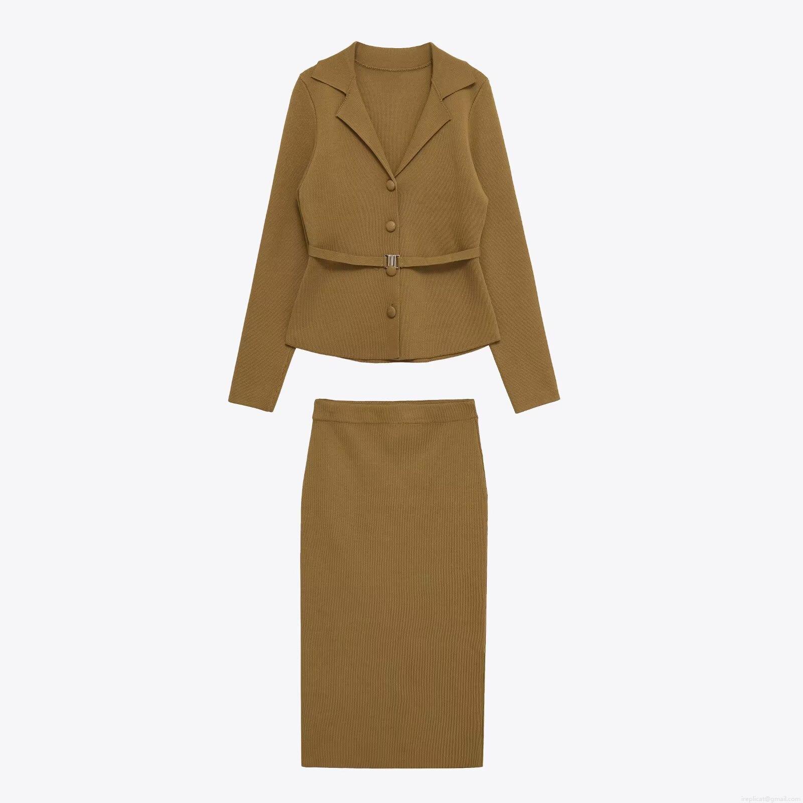 • Women's 2 Piece Knit Skirt Set Ribbed Long Sleeve Lapel Button Top With Belt And Midi Skirt Casual Streetwear Elegant Fall Winter Outfit
