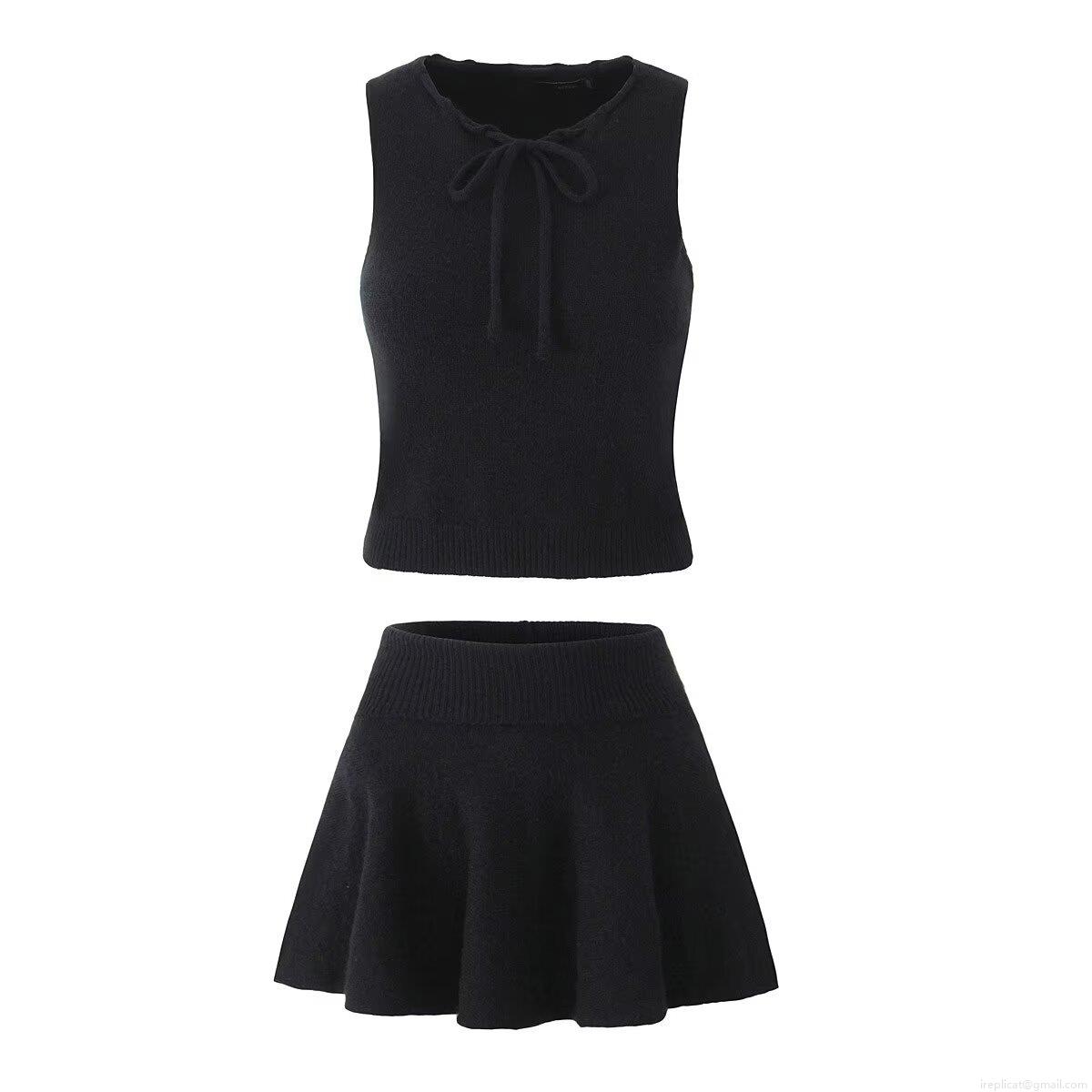 • Women's 2 Piece Knit Skirt Set Sleeveless Bow Tie Vest Top High Waist Pleated Mini Skirt Outfits Streetwear Autumn Casual Knitted Suit