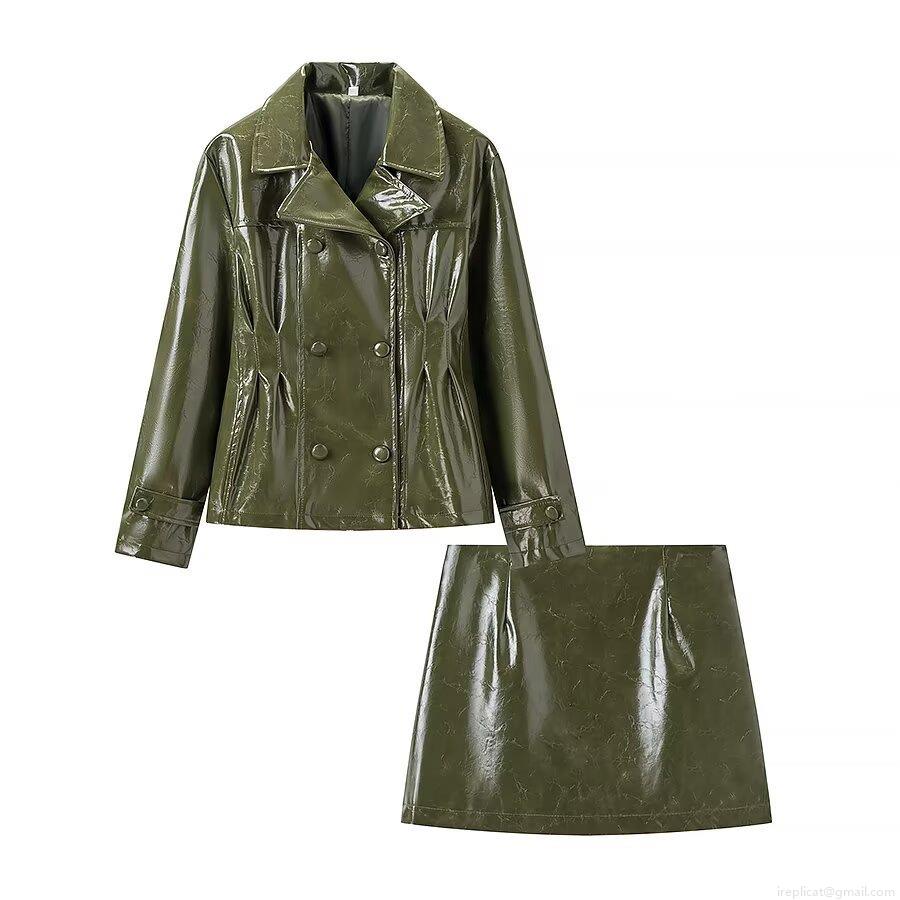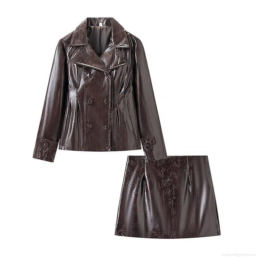 • Women's 2 Piece Shiny Faux Leather Skirt Set Fashion Double Breasted PU Jacket and Mini Skirt Outfit Streetwear Suit for Clubwear Party