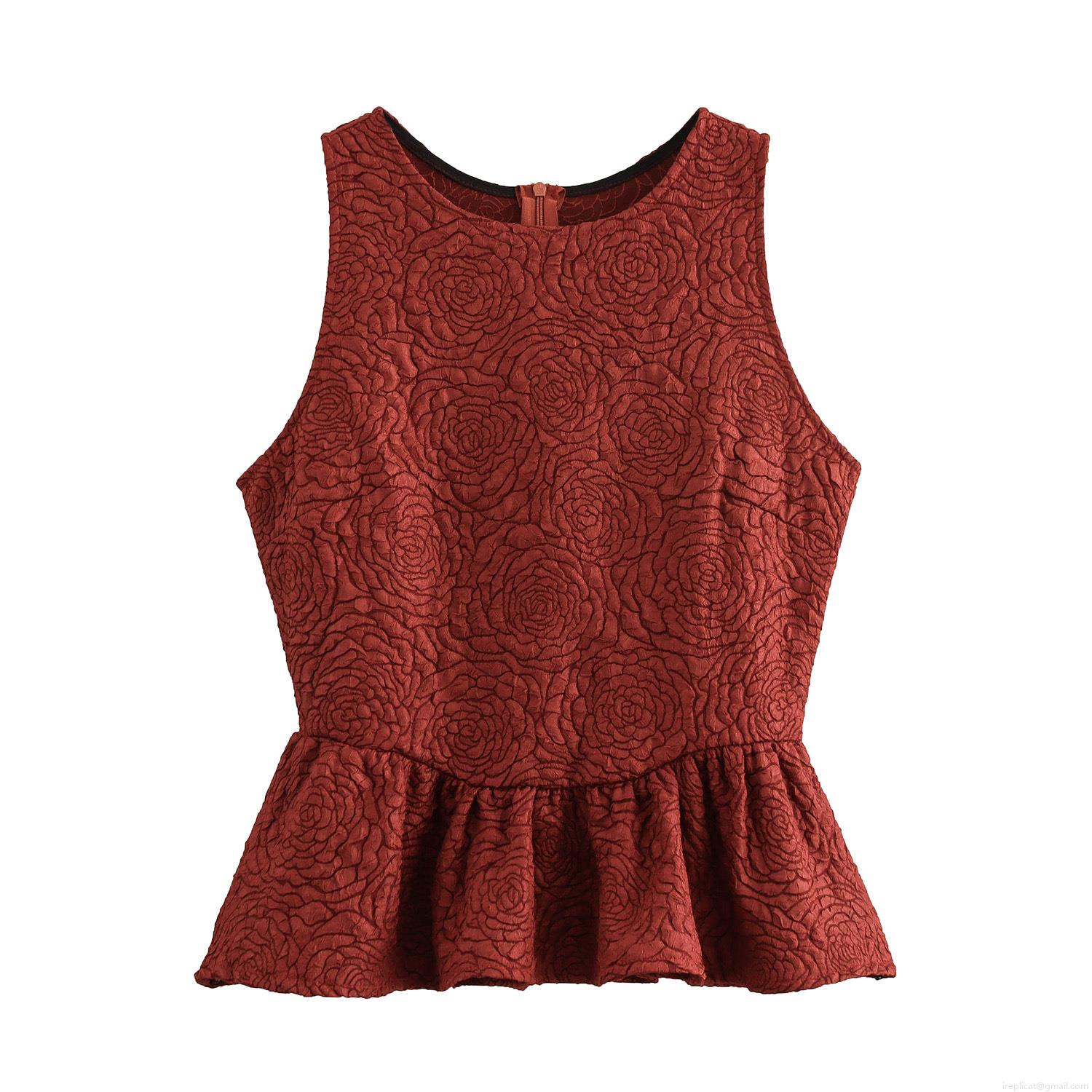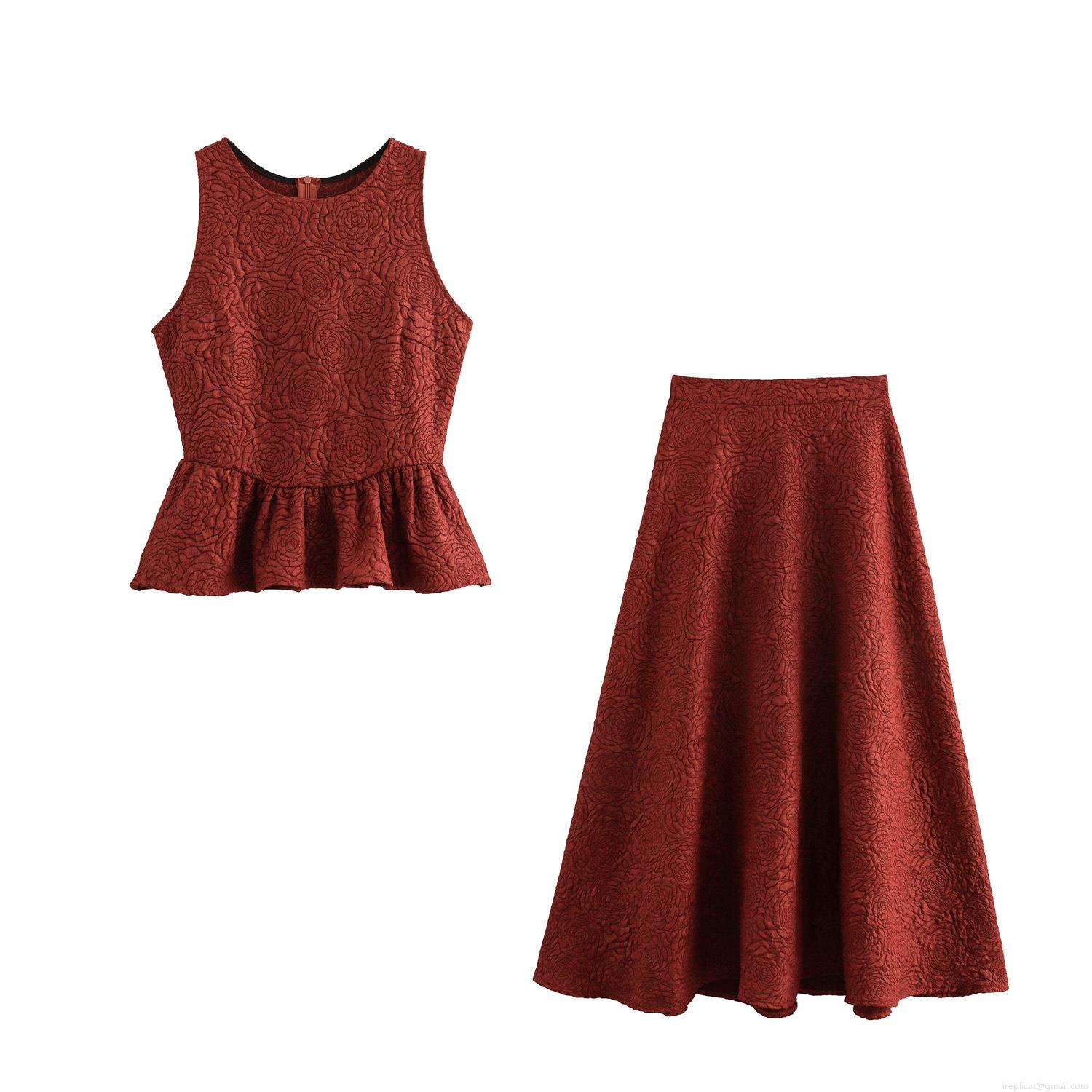 • Women's 2 Piece Skirt Set Sleeveless Peplum Top And Rose Jacquard A-Line Maxi Skirt Polyester Vacation Outfit Brick Red Sets