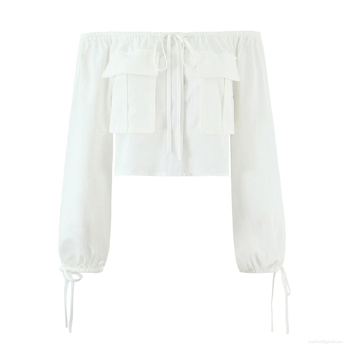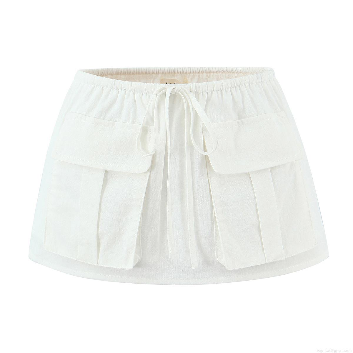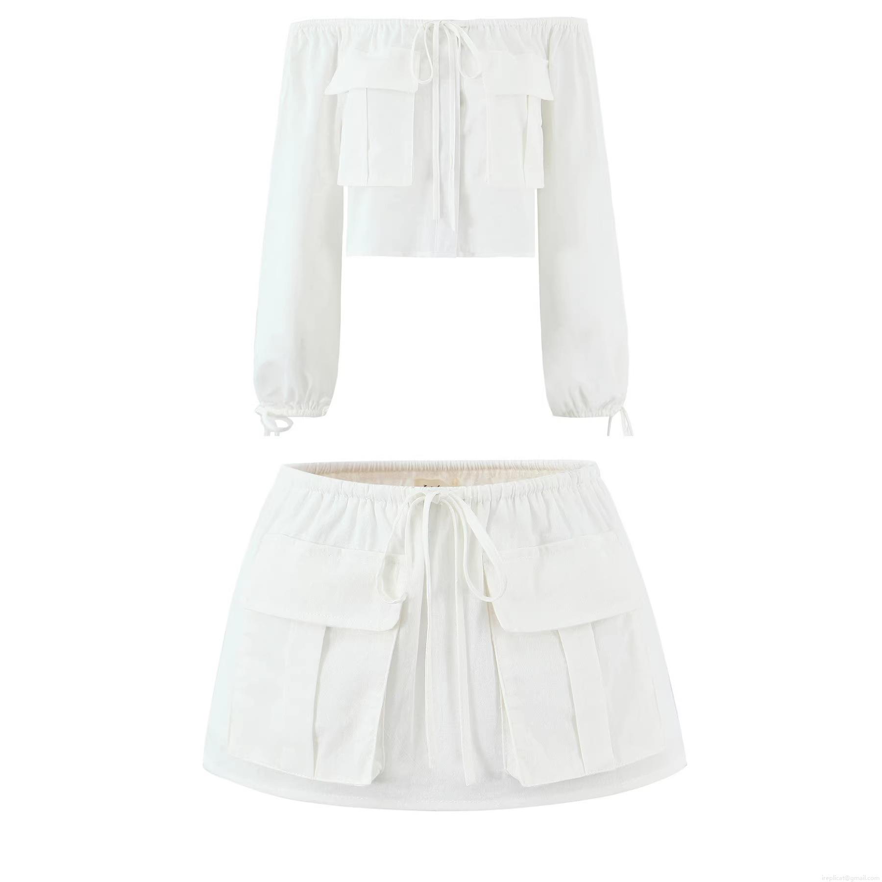 • Women's 2 Piece White Cargo Set Off Shoulder Long Sleeve Crop Top And Mini Skirt With Multi Pockets Casual Streetwear Summer Outfit For Women