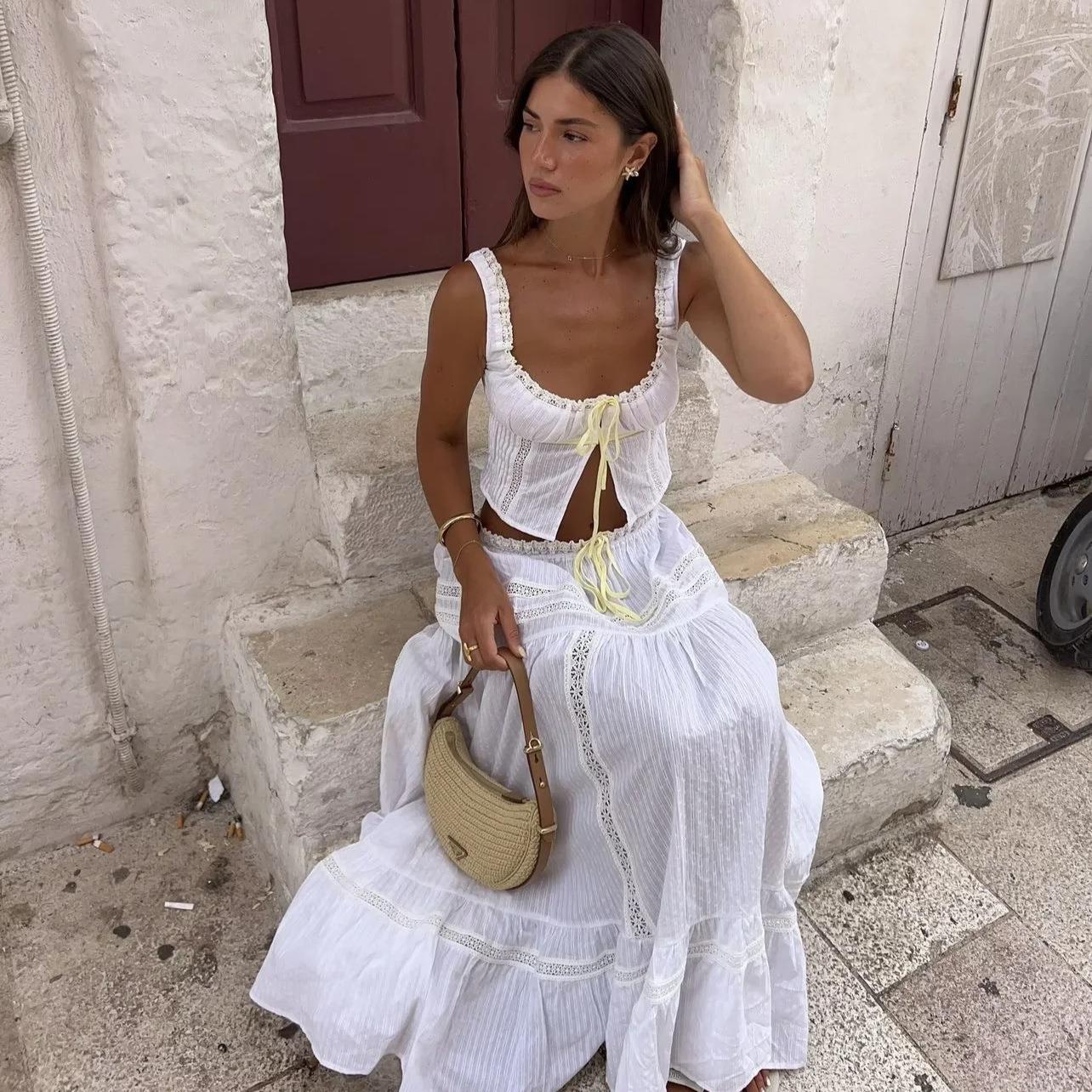 • Women's 2 Piece White Lace Skirt Set French Vacation Style Cotton Blend Hollow Out Camisole Top Tiered Maxi Skirt Boho Beach Outfit