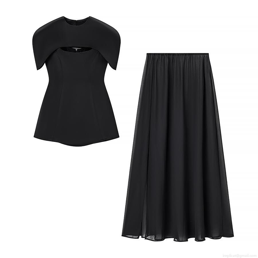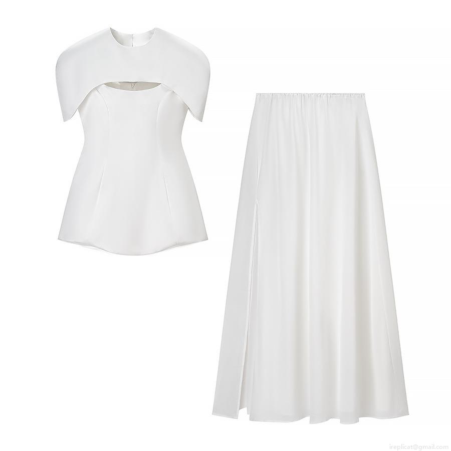 • Women's 2-Piece Fashion Set Hollow Out Shawl Short Sleeve Top And Pleated High Waist Maxi Skirt Casual Solid Color Streetwear Suit