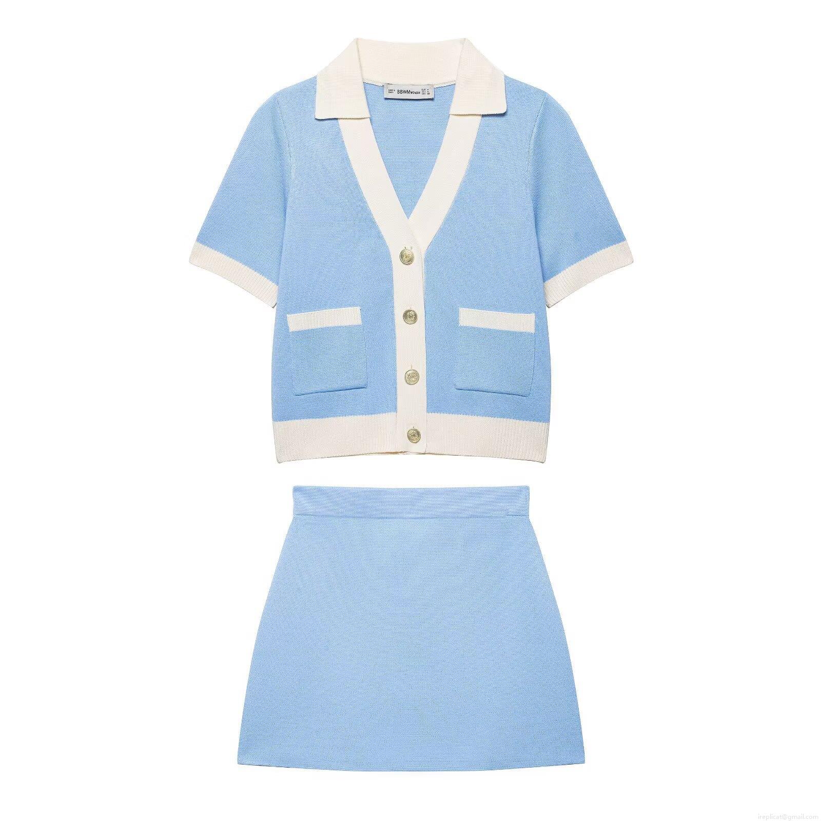 • Women's 2-Piece Knit Set Contrast Color V-Neck Short Sleeve Cardigan With Gold Relief Buttons And Mini A-Line Skirt Elegant Summer Streetwear Outfit
