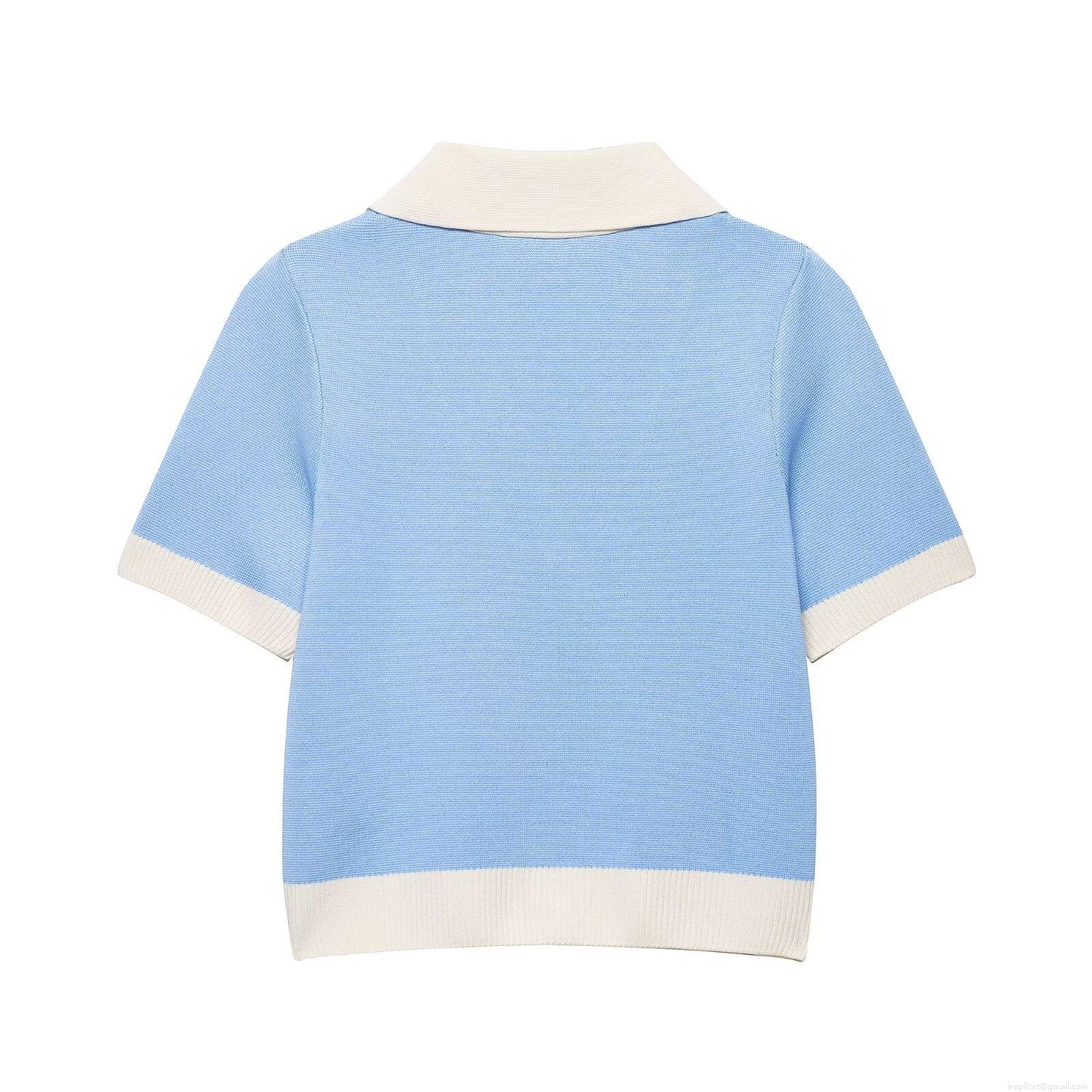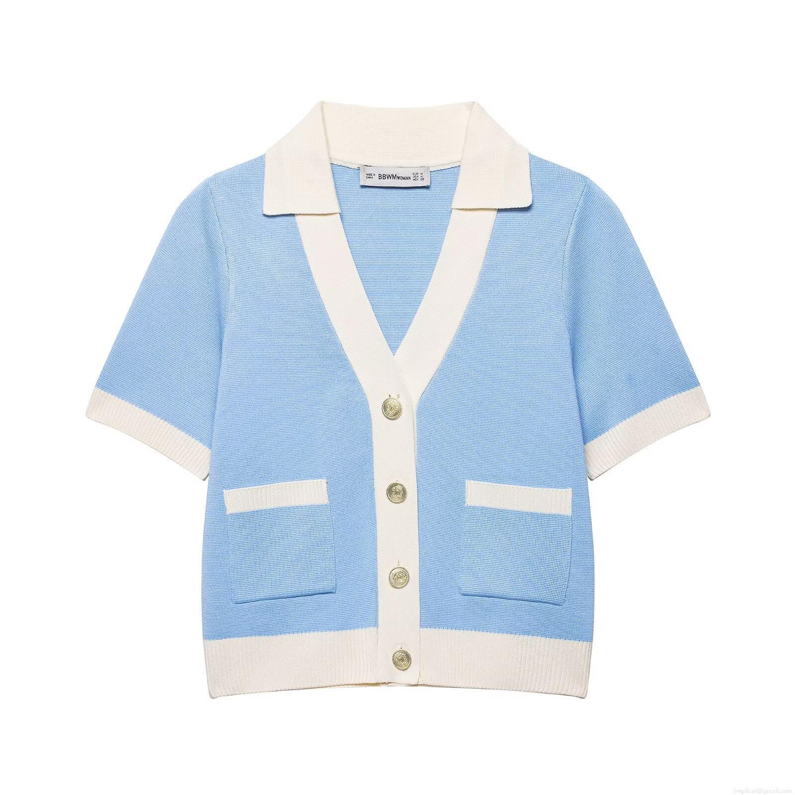 Women's 2-Piece Knit Set Contrast Color V-Neck Short Sleeve Cardigan With Gold Relief Buttons And Mini A-Line Skirt Elegant Summer Streetwear Outfit