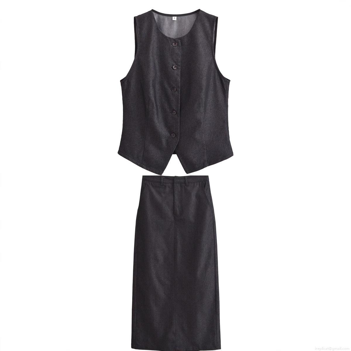 Women's 2-Piece Skirt Set Slim Fit V-Neck Single Breasted Vest And Midi Straight Skirt Denim Texture Polyester Suit Streetwear Outfits