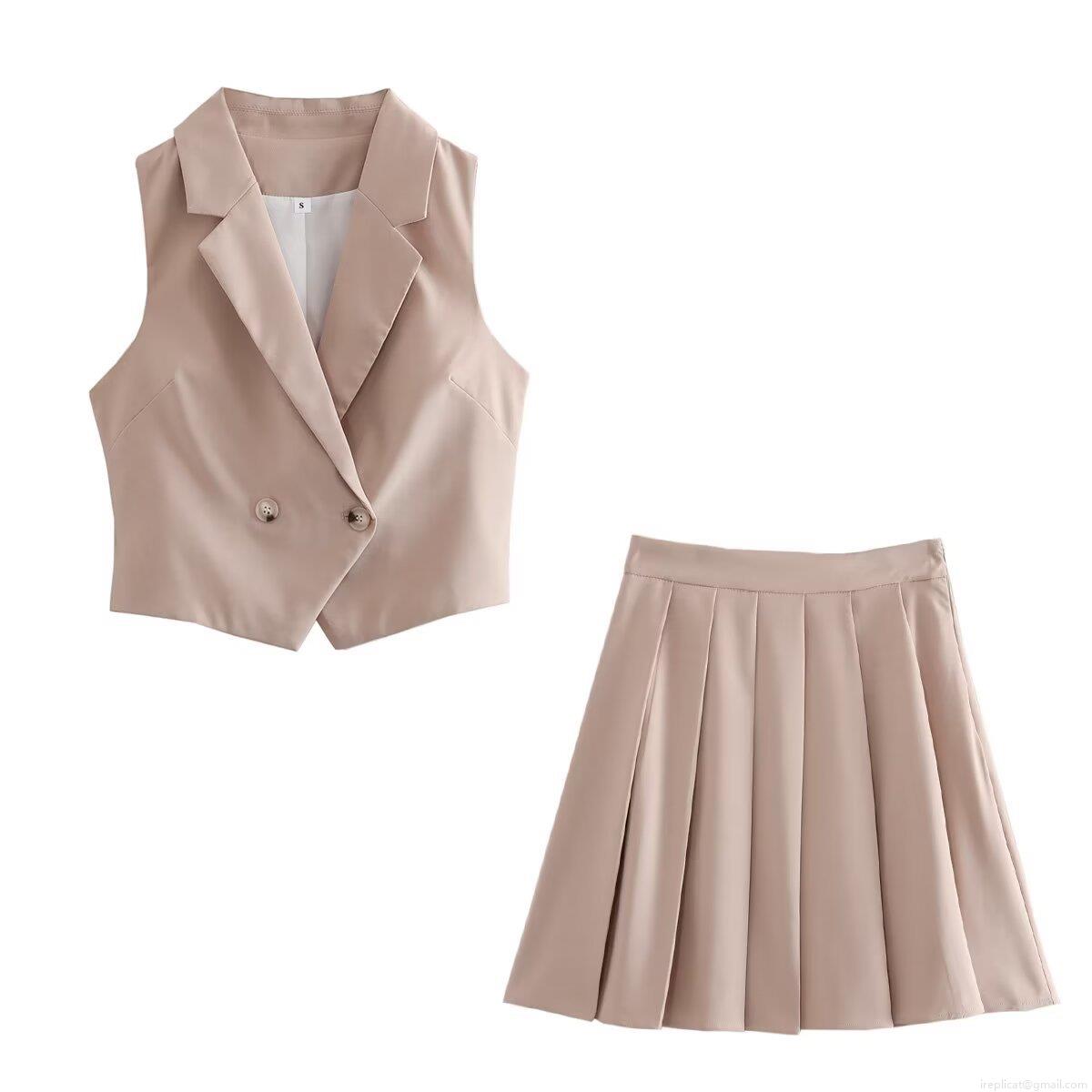 Women's 2-Piece Sleeveless Suit Vest And Pleated Mini Skirt Set Khaki Polyester Double Breasted Waistcoat Casual Streetwear Outfit For Women