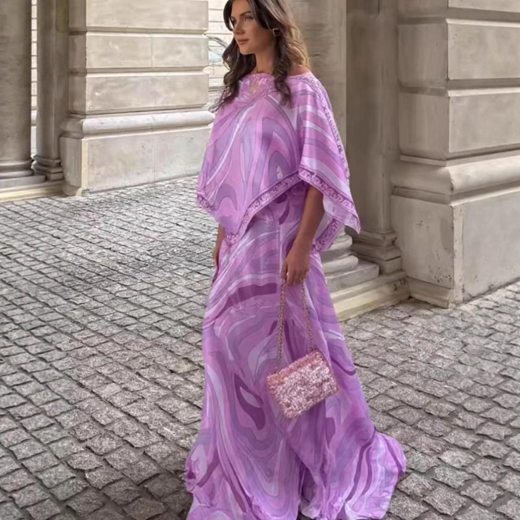 Women's 3 Piece Set Purple Pink Marble Print Tube Top Cape And Maxi Skirt Sexy Vacation Beachwear Polyester Blend Streetwear Suit For Women