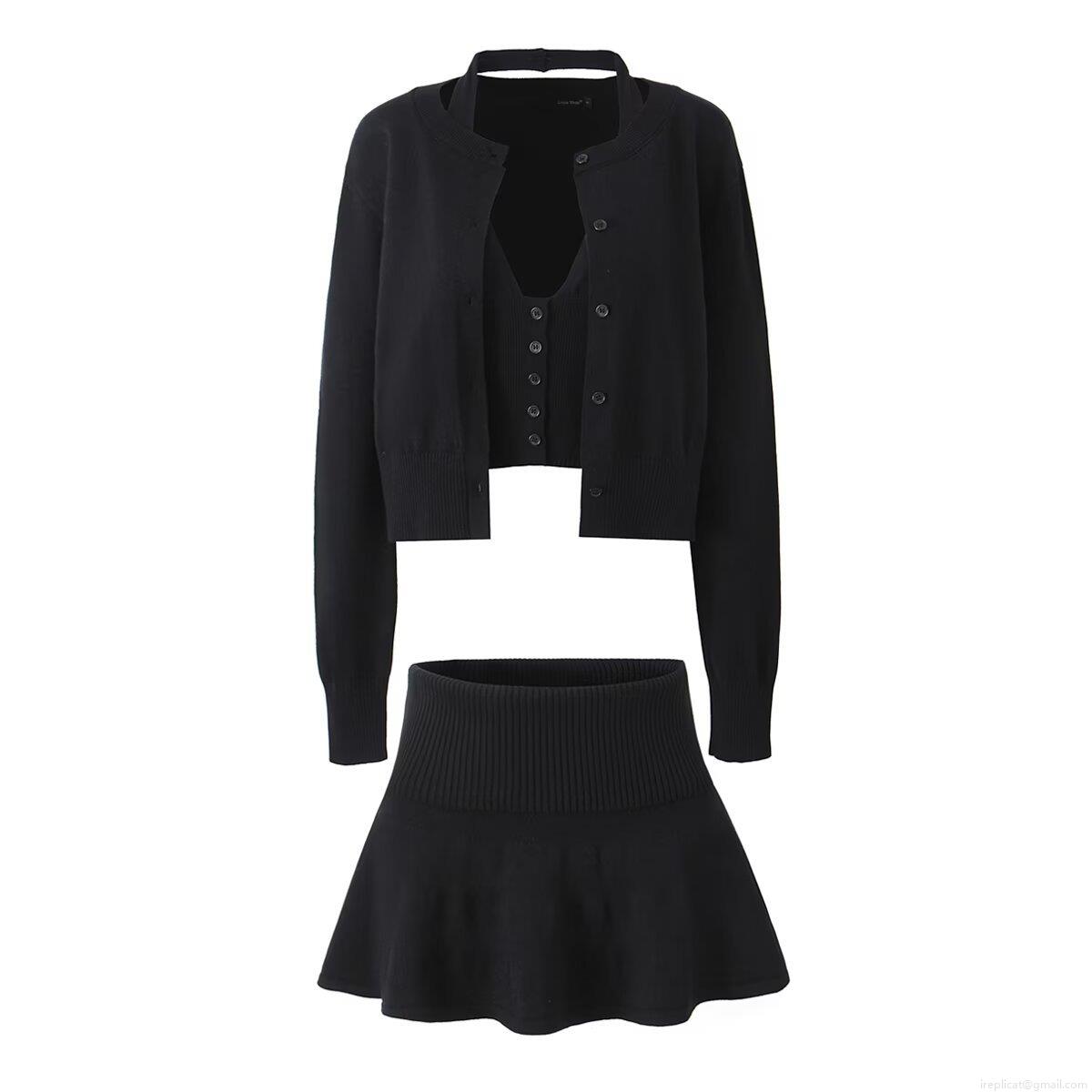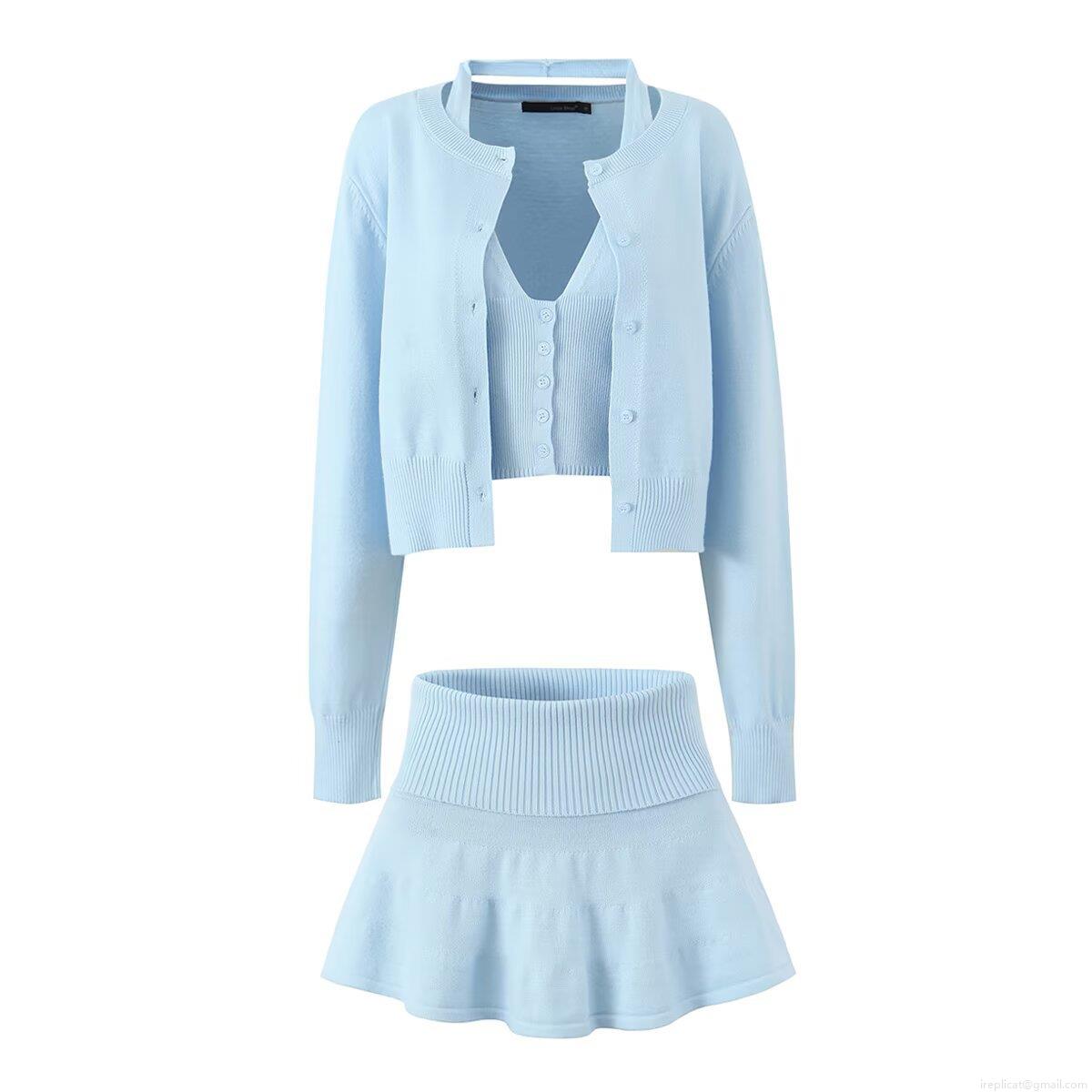 Women's 3-Piece Knit Set Ribbed Long Sleeve Button Cardigan Halter Neck Crop Top And High Waist Mini Pleated Skirt Solid Color Casual Streetwear Autumn Outfits