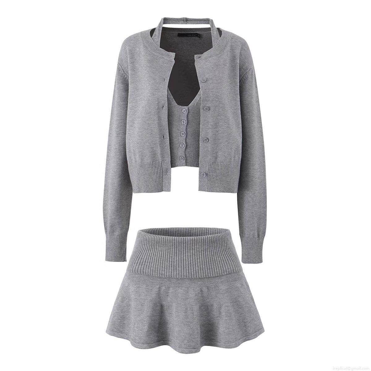 • Women's 3-Piece Knit Set Ribbed Long Sleeve Button Cardigan Halter Neck Crop Top And High Waist Mini Pleated Skirt Solid Color Casual Streetwear Autumn Outfits