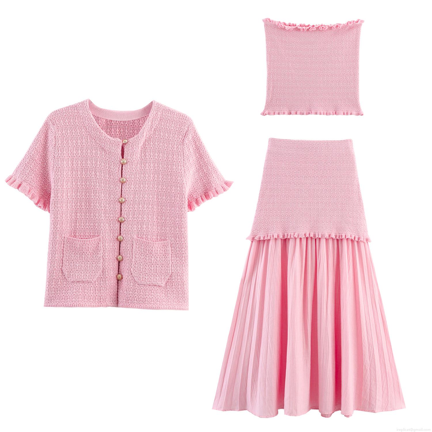 • Women's 3-Piece Knit Skirt Set Elegant Short Sleeve Cardigan With Golden Buttons Tube Top And Spliced Pleated Midi Skirt Casual Streetwear Outfit For Women