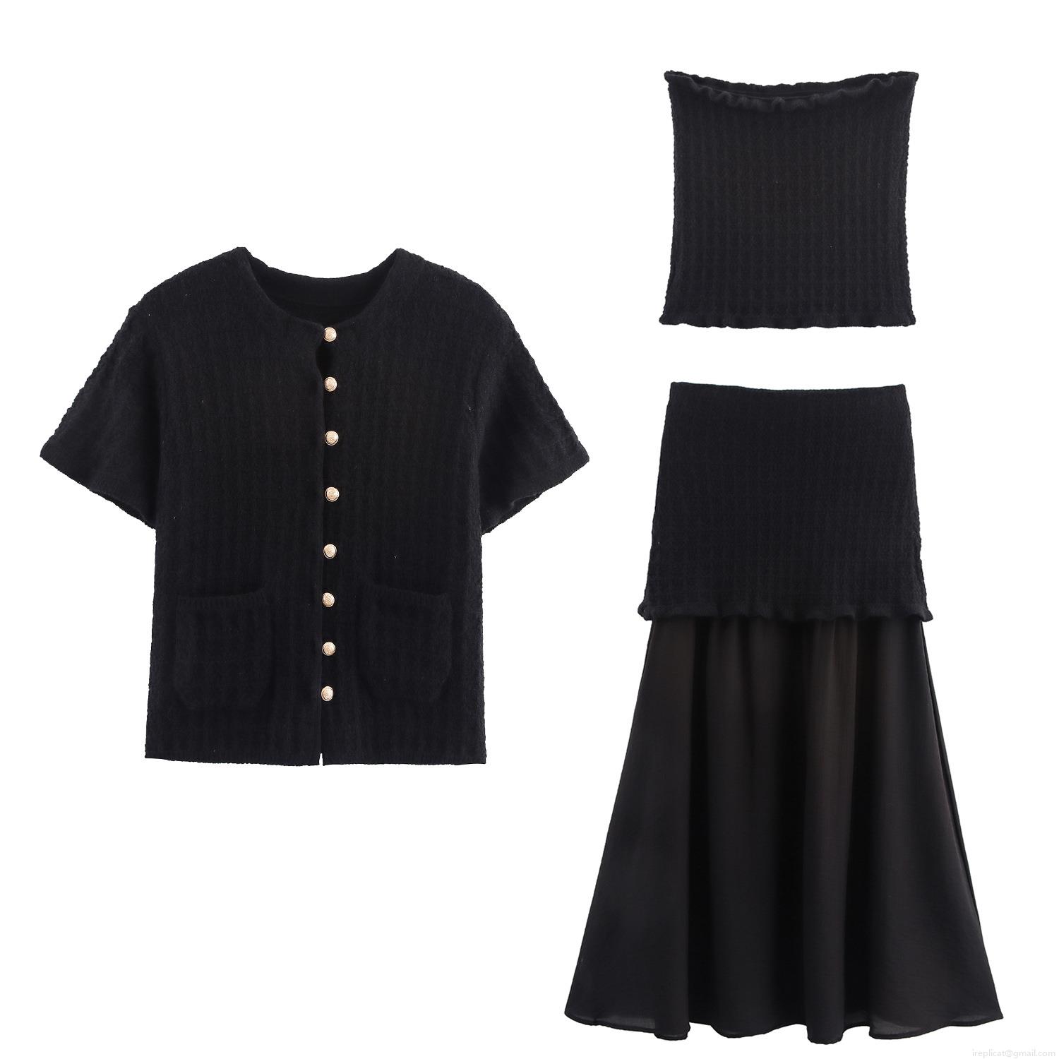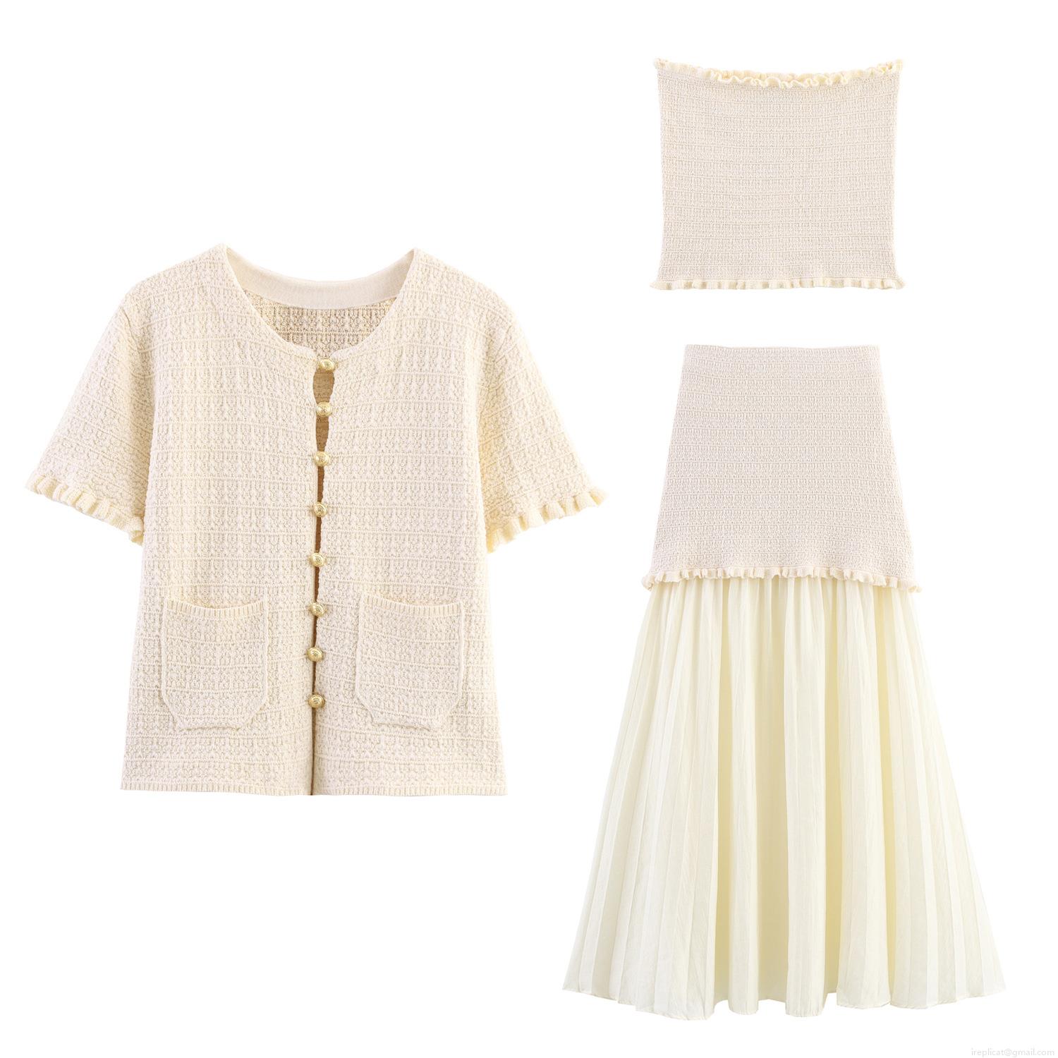 Women's 3-Piece Knit Skirt Set Elegant Short Sleeve Cardigan With Golden Buttons Tube Top And Spliced Pleated Midi Skirt Casual Streetwear Outfit For Women