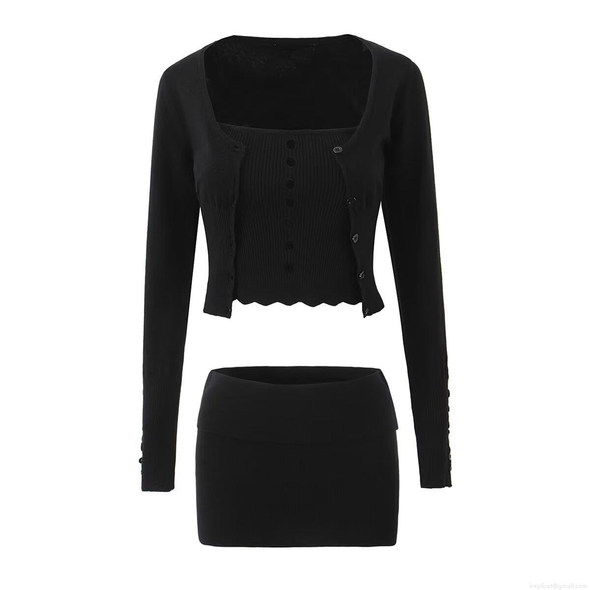 • Women's 3-Piece Knit Skirt Set Sexy Hollow Out Tube Top Ribbed V-Neck Button Cardigan High Waist Mini Skirt Casual Streetwear Knitted Outfit