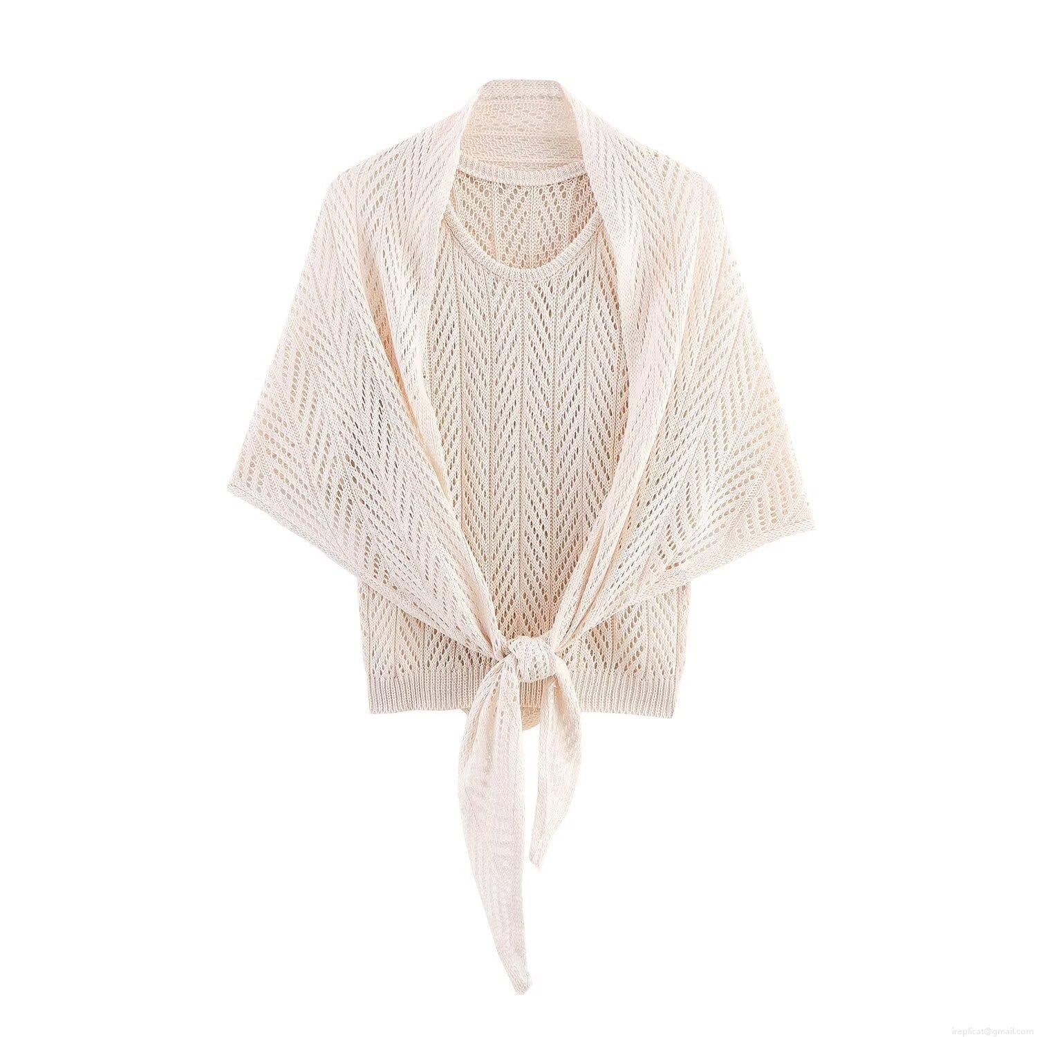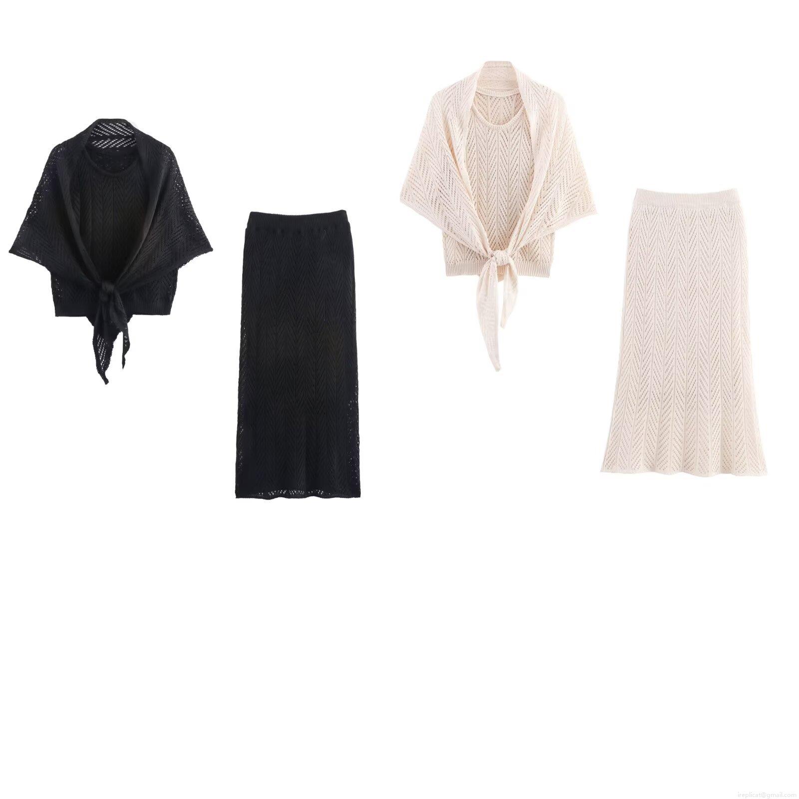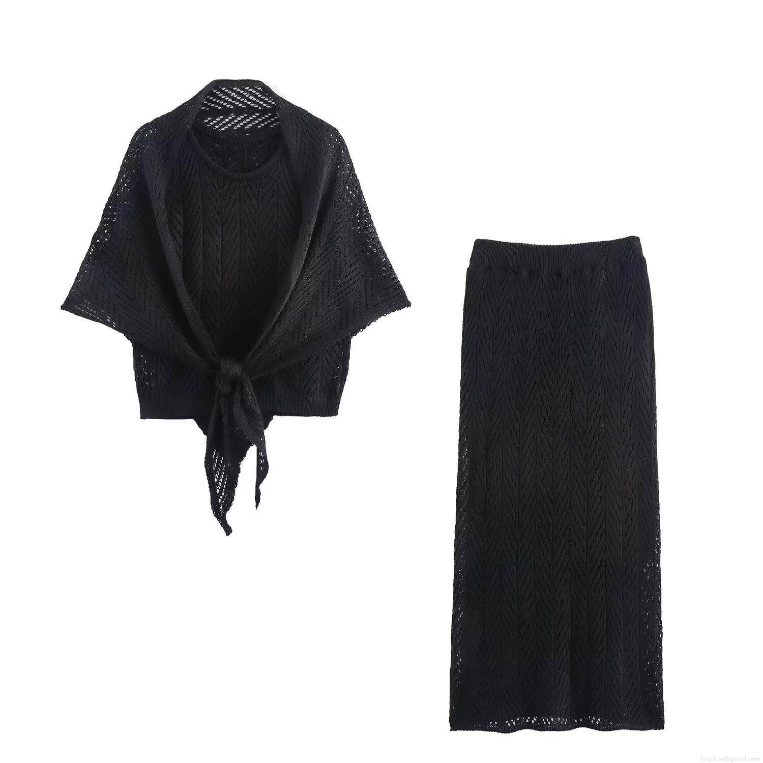• Women's 3-Piece Knitted Skirt Set Elegant Hollow Out Crochet Tied Shawl Vest Top And High Waist A-Line Midi Skirt For Vacation Street Style Polyester Knit Outfits