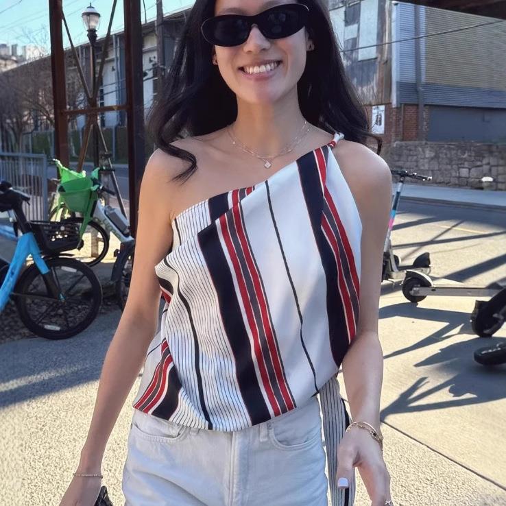• Women's Asymmetrical Stripe Satin Top and Skirt Set Fashion One Shoulder Sleeveless Stripe Shirt and Tie Waist Wrap Midi Skirt Outfit