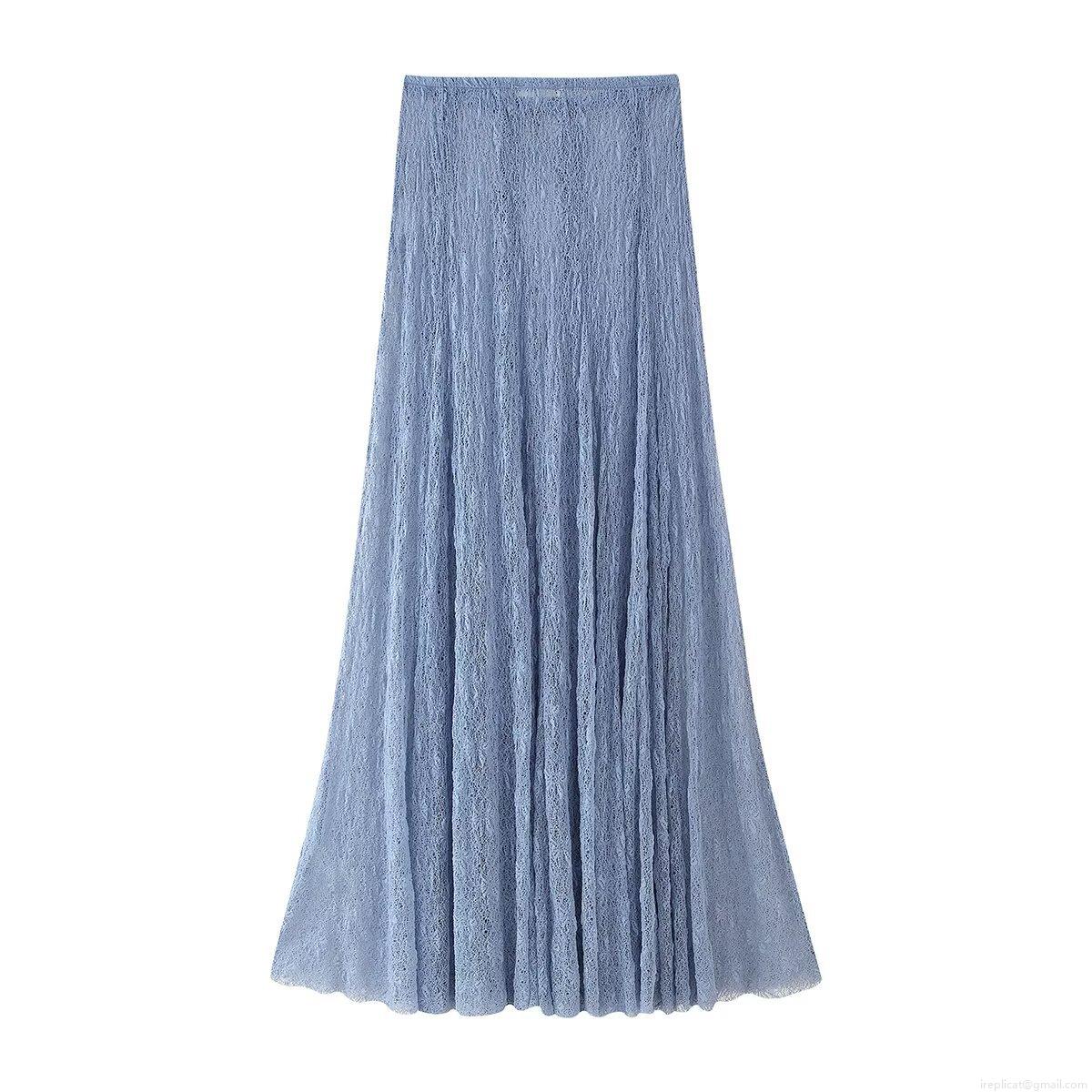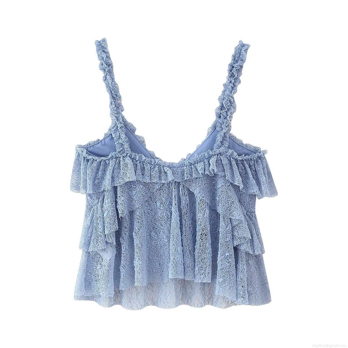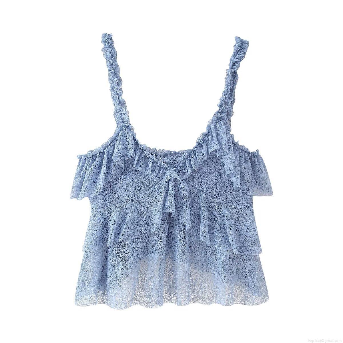 • Women's Blue Floral Lace Ruffle Crop Cami Top And High Waist A-Line Maxi Skirt Set Elegant Summer Beach Vacation Two Piece Outfits Streetwear Party Dress