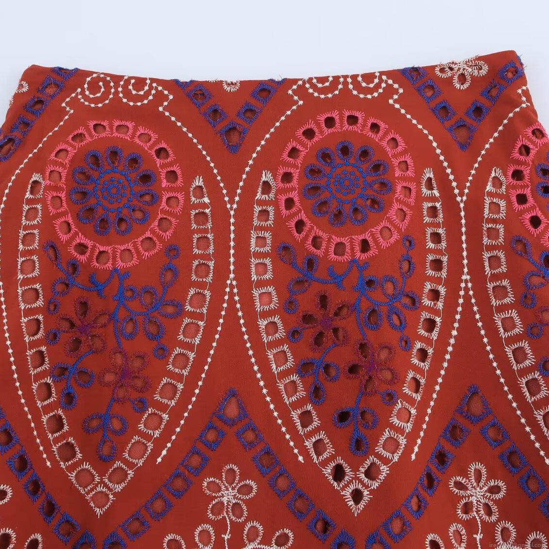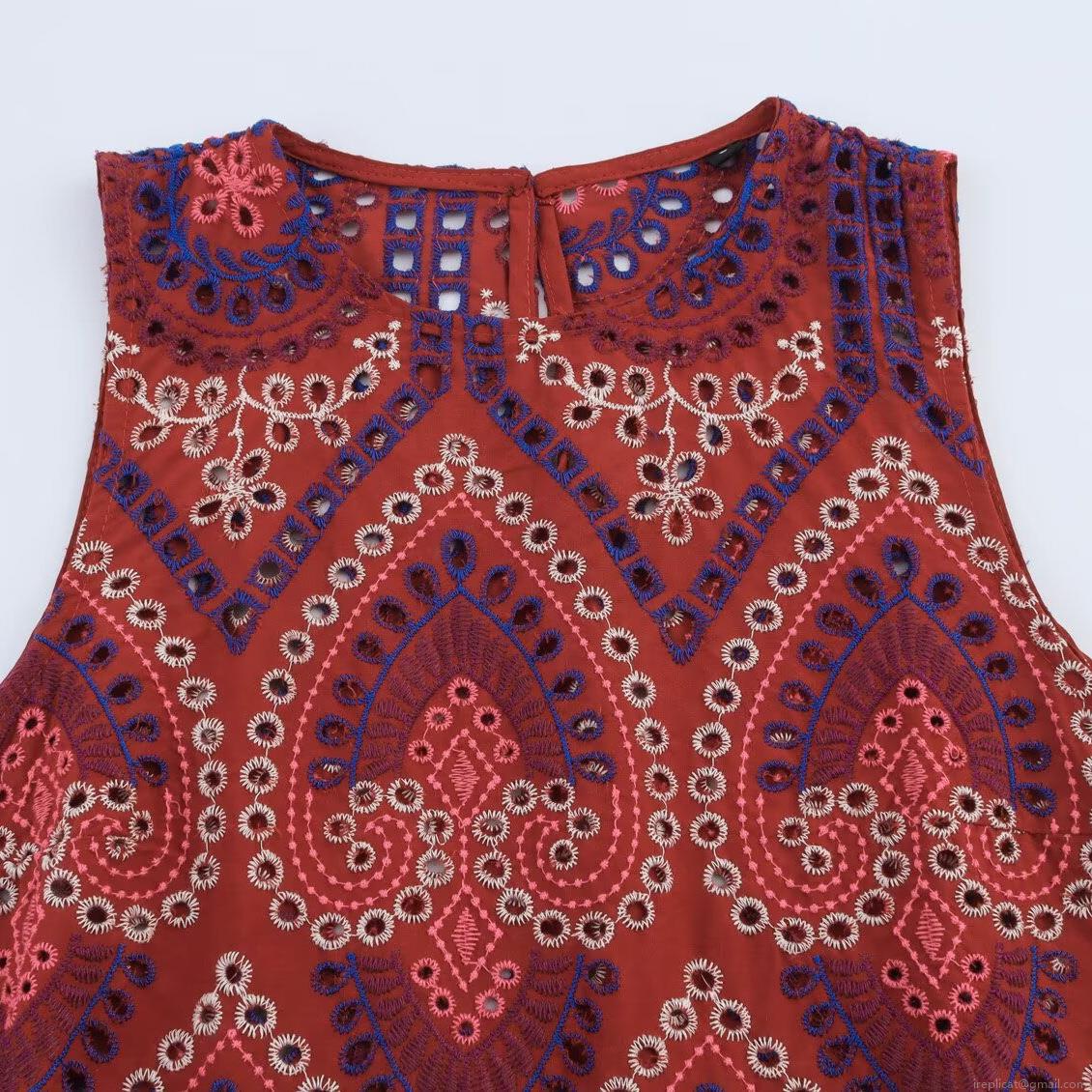 • Women's Bohemian Brick Red Embroidery Hollow-out Eyelet Sleeveless Top And Midi Skirt Set Cotton Blend Two Piece Vacation Ethnic Outfit