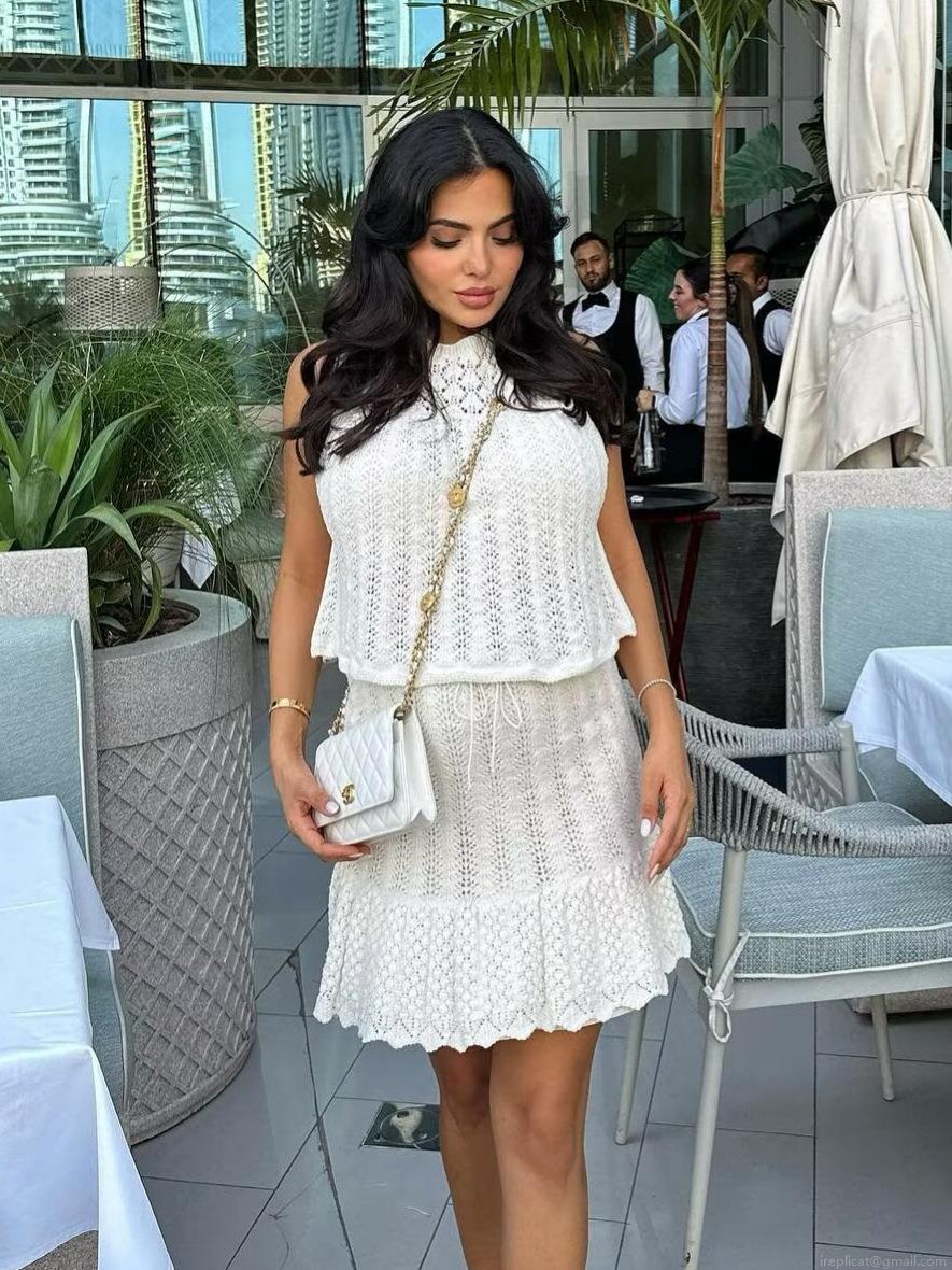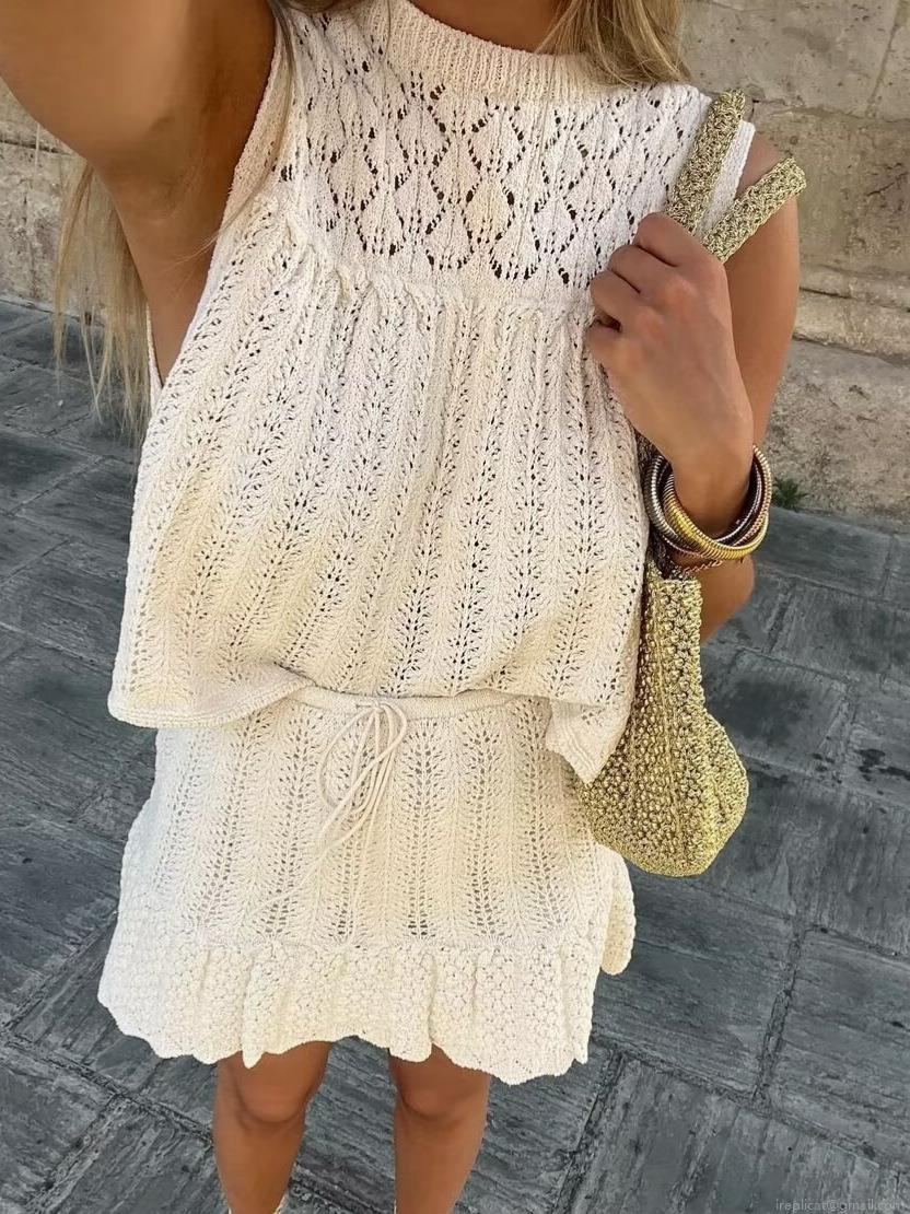 • Women's Bohemian Knit 2 Piece Outfits Crochet Hollow Out Sleeveless Top And Ruffle Mini Skirt Set Summer Beach Vacation Streetwear