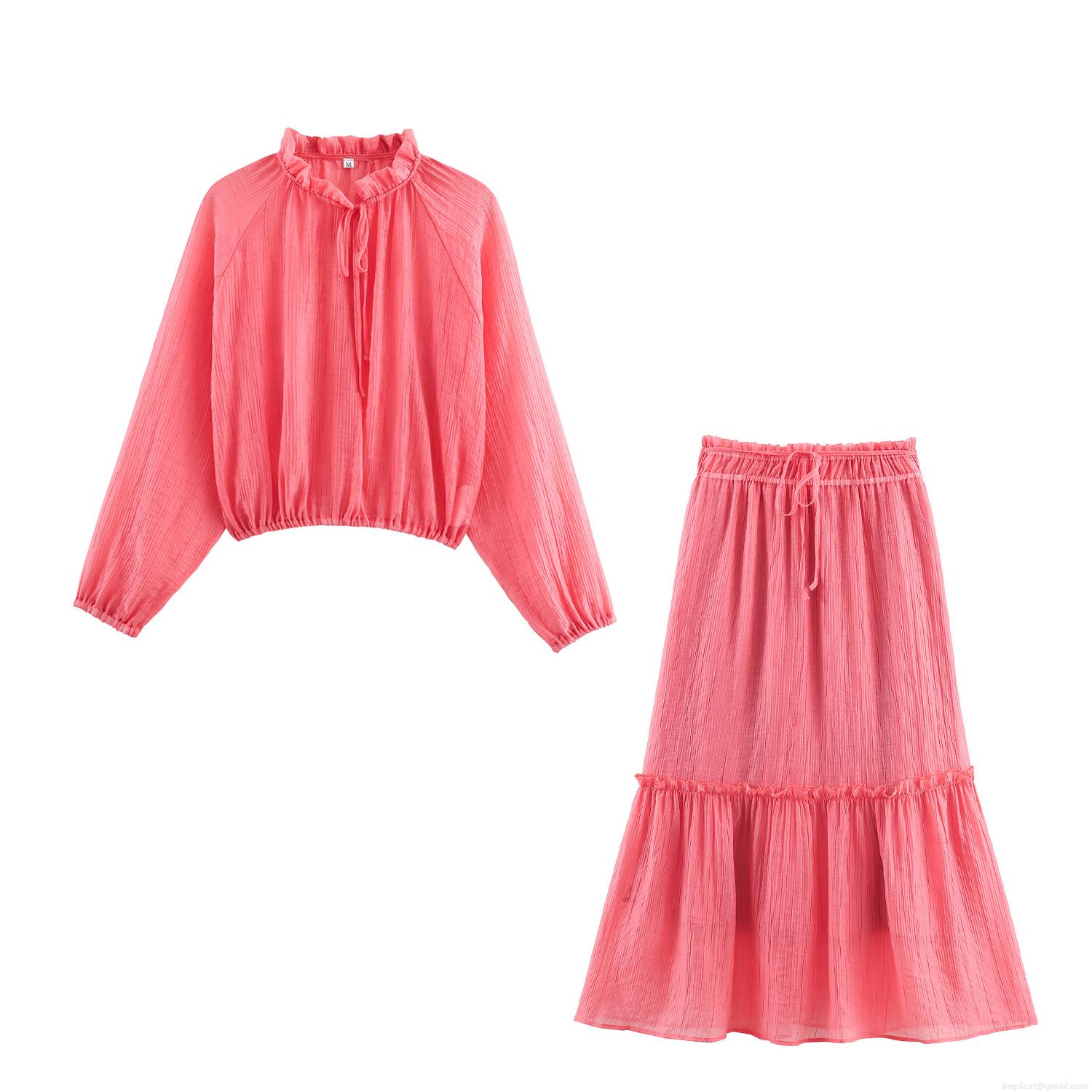 • Women's Bohemian Pleated Shirt and Long Skirt Two-Piece Set Polyester Ruffle Tie-Front Long Sleeve Blouse and Tiered Cake Skirt Vacation Outfit