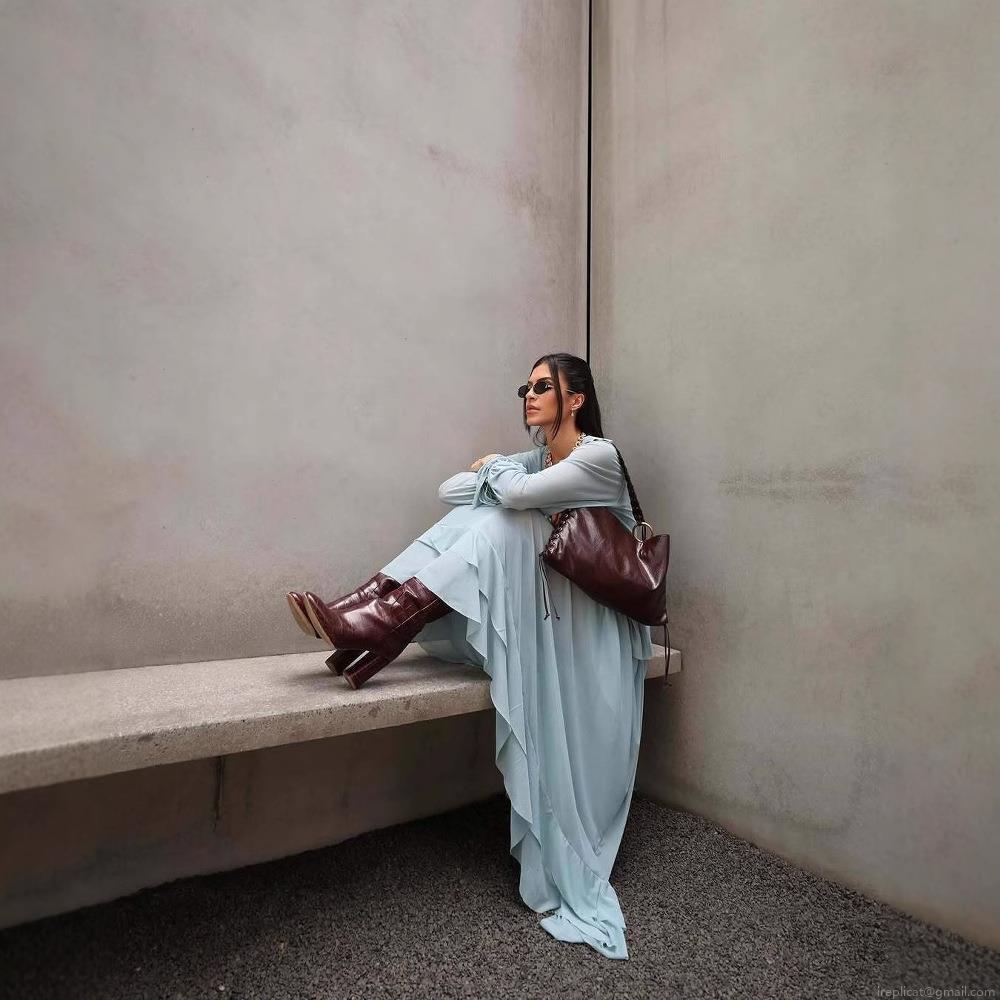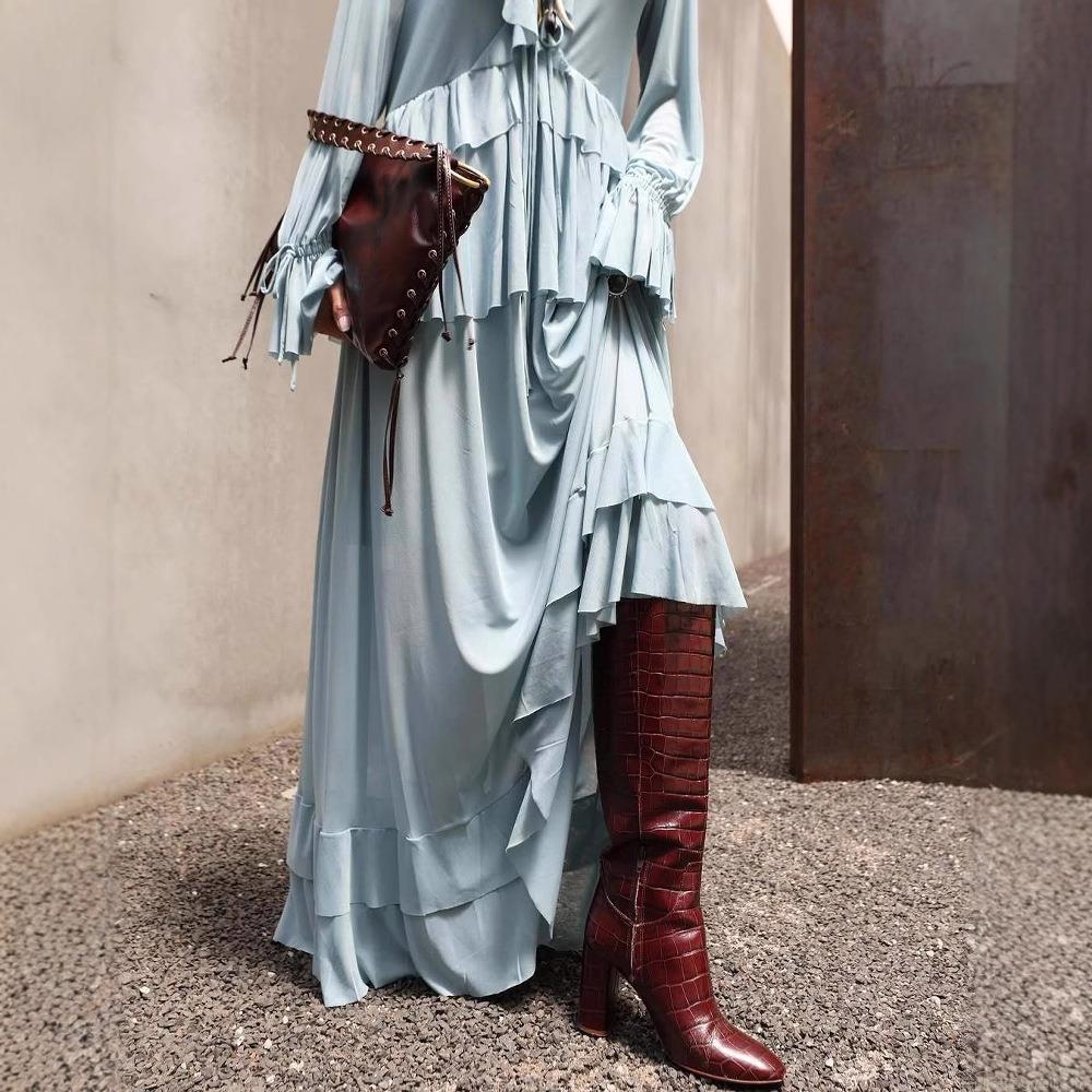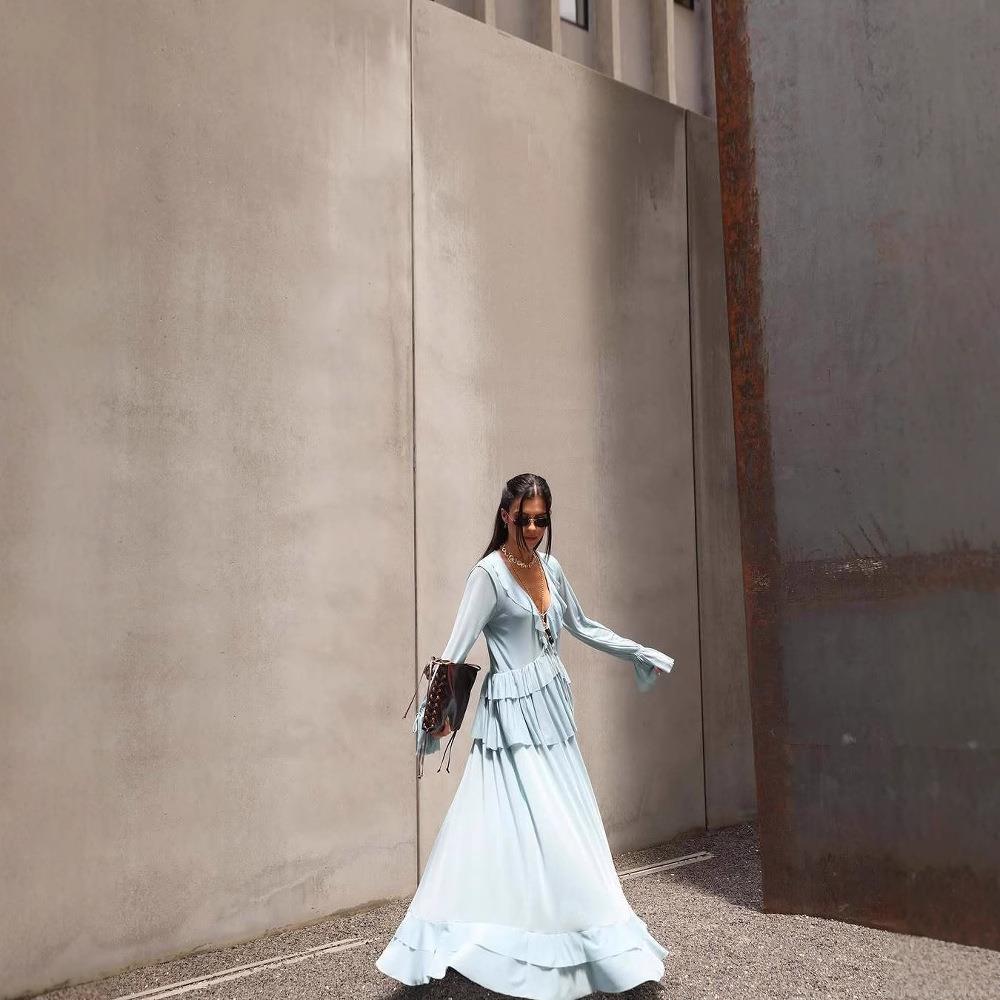 • Women's Bohemian Two-Piece Set Polyester Ruffled Long Sleeve V-Neck Top and Tiered Maxi Skirt Sky Blue Summer Vacation Beach Outfit
