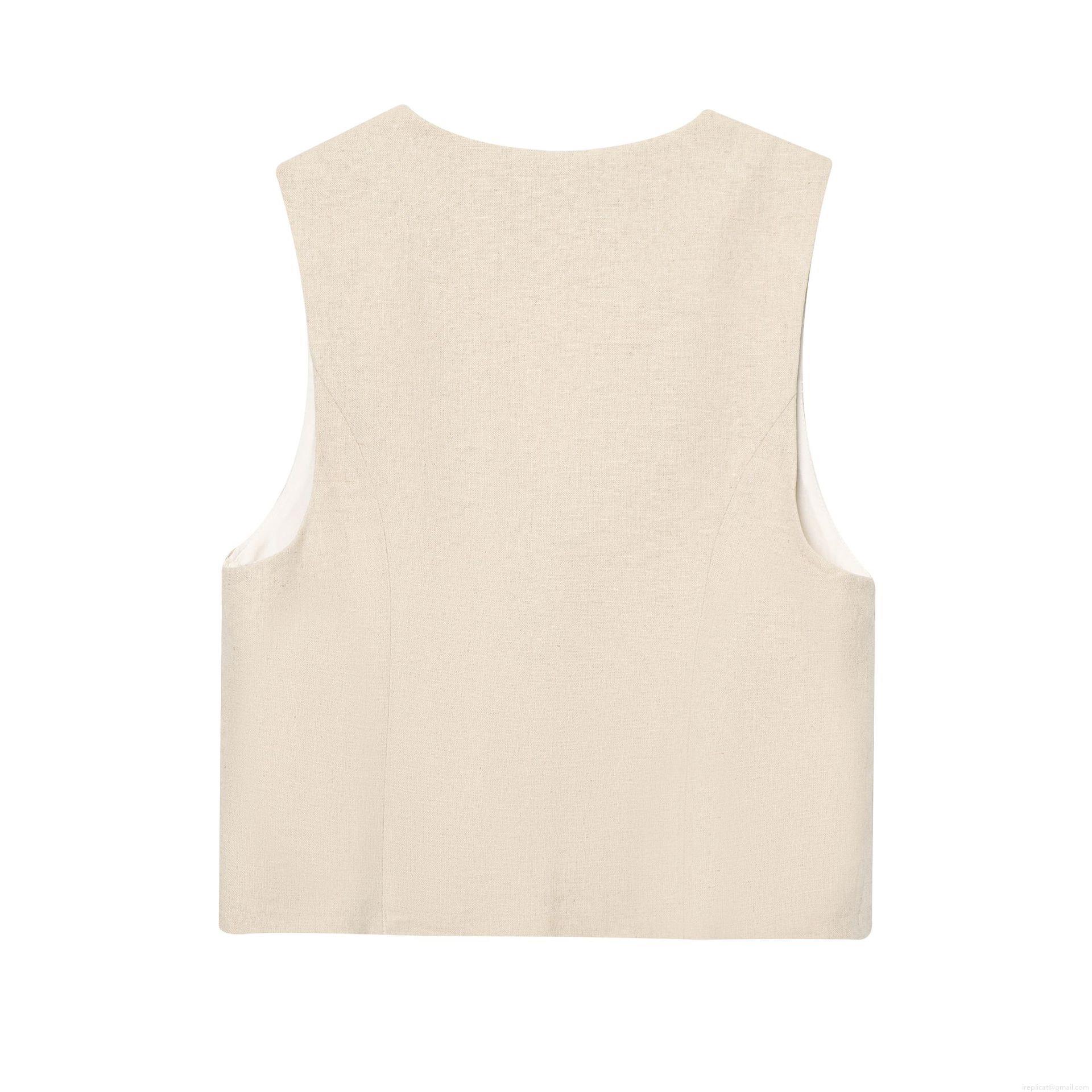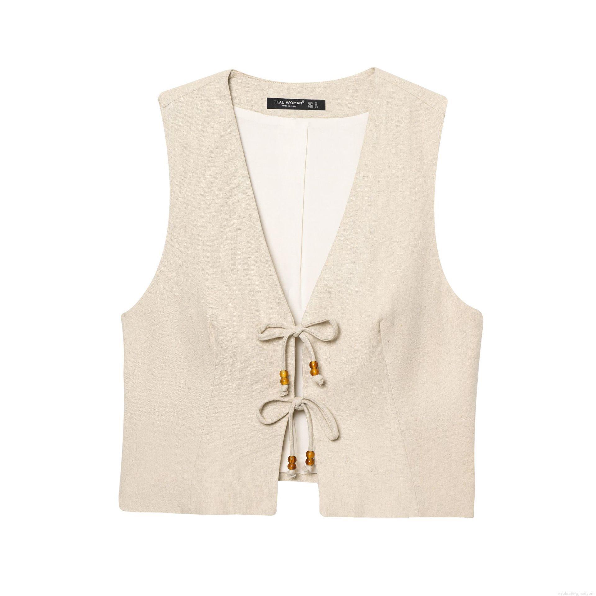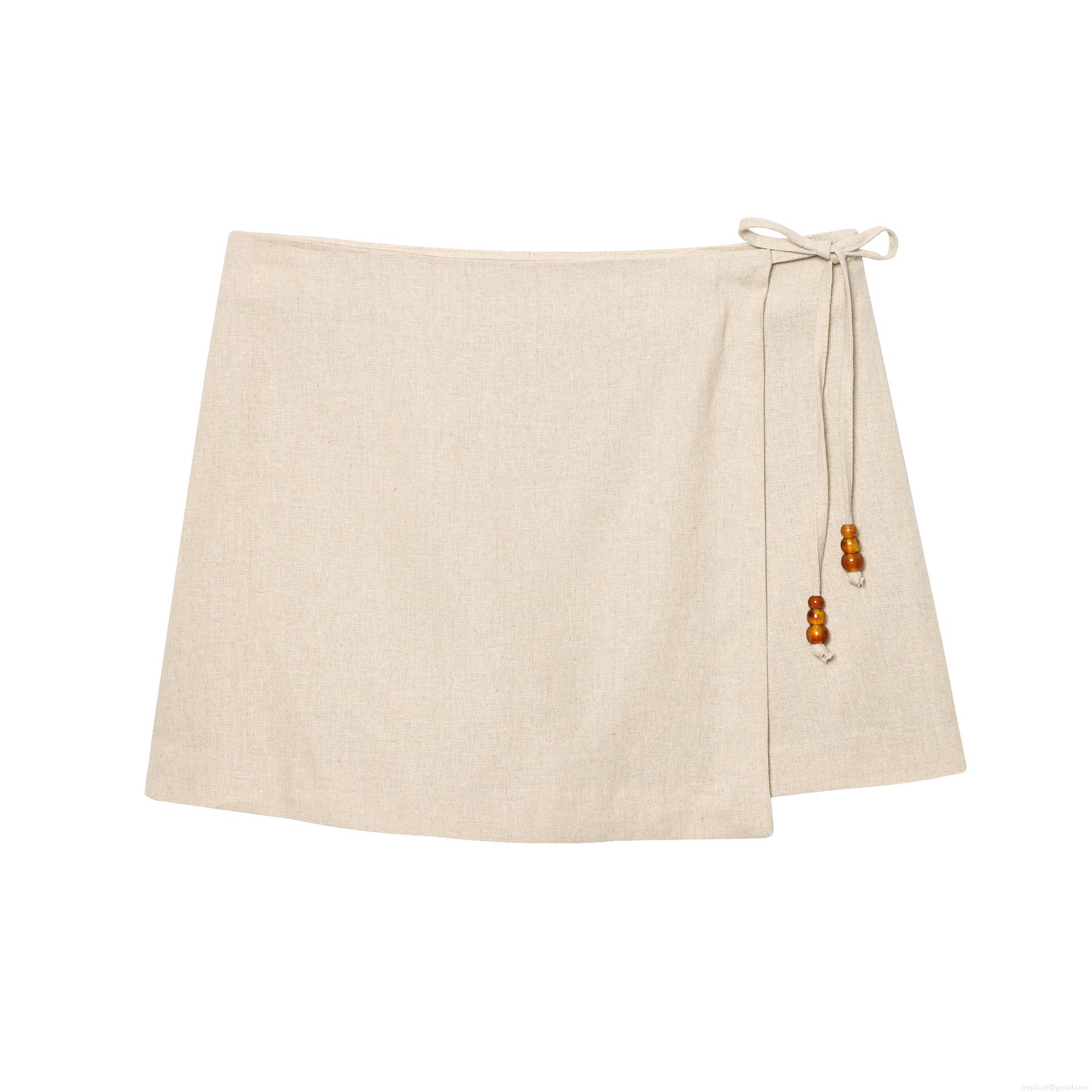 • Women's Casual Beige Linen-Look Two-Piece Set Deep V-Neck Tie-Up Crop Vest Top And Wrap Mini Skirt With Wood Beads Summer Beach Vacation Outfit