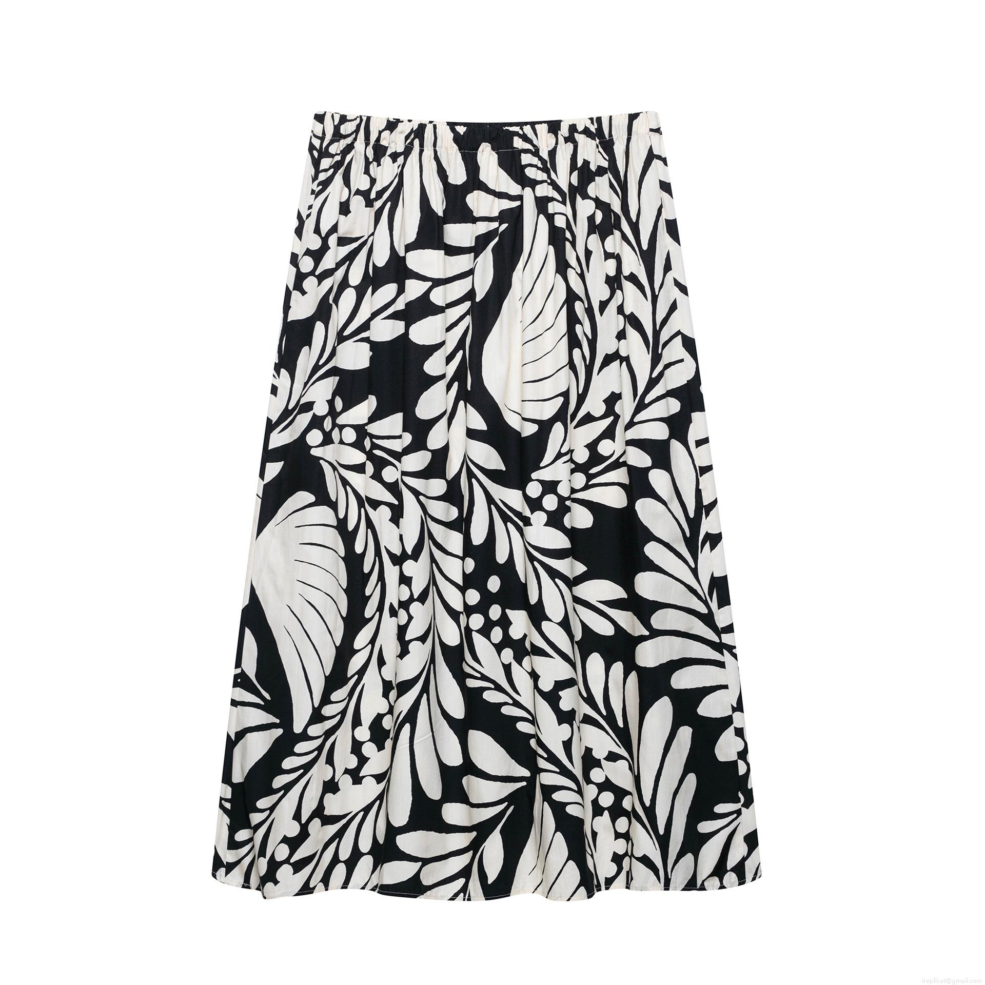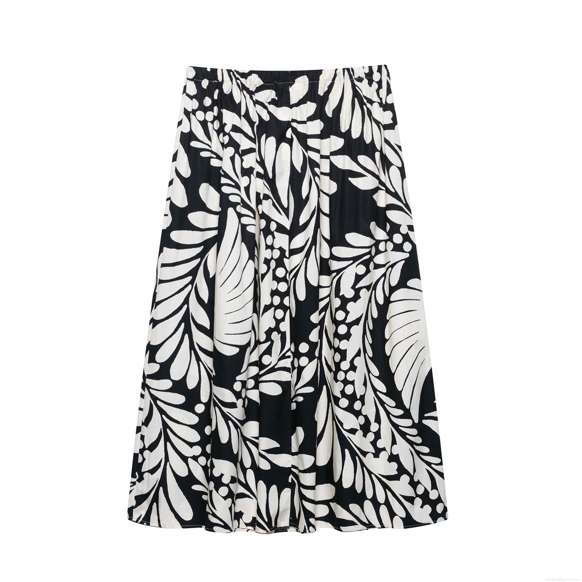• Women's Casual Black White Plant Leaf Print Two Piece Set Long Sleeve Round Neck Shirt And High Waist A-Line Midi Skirt Elegant Streetwear Outfit