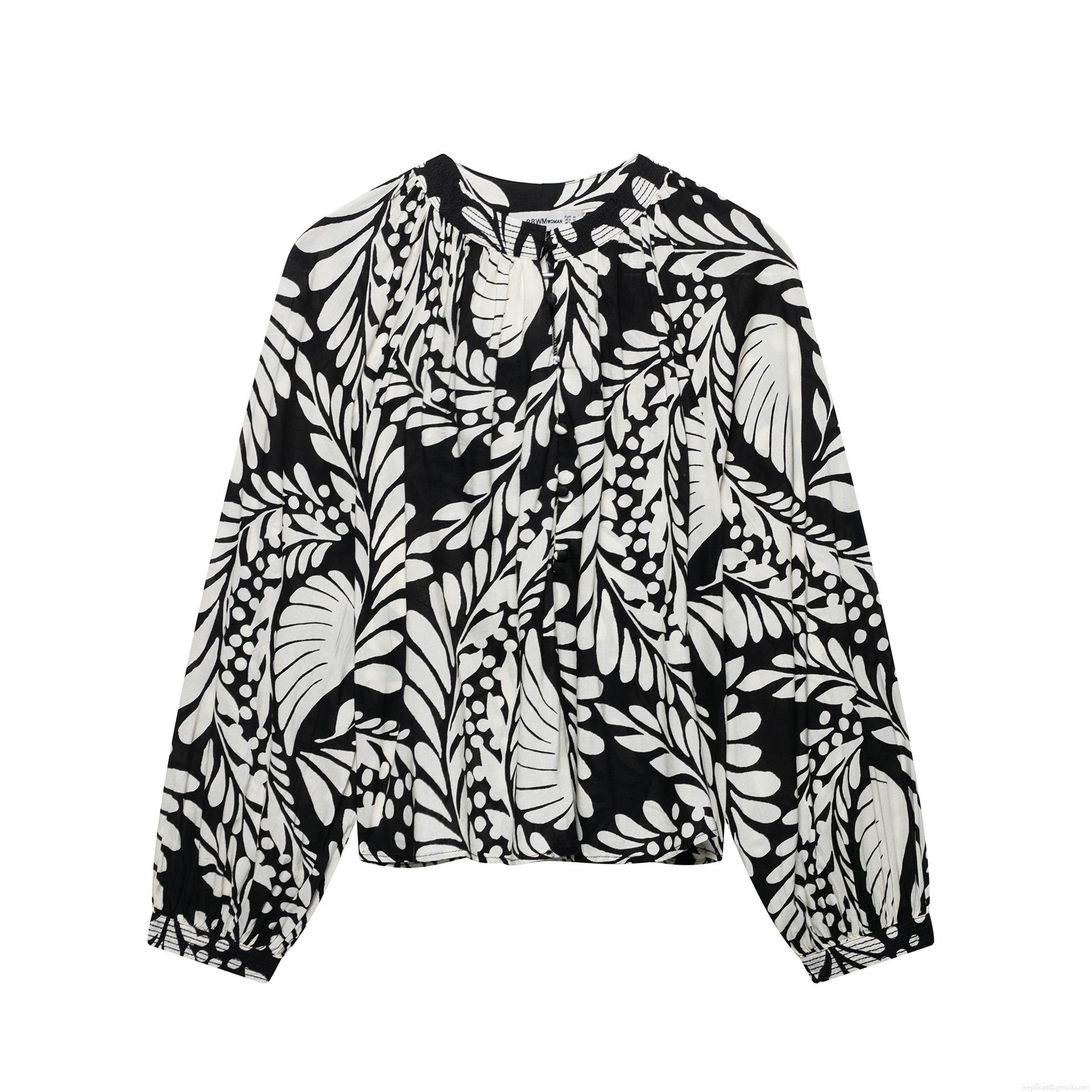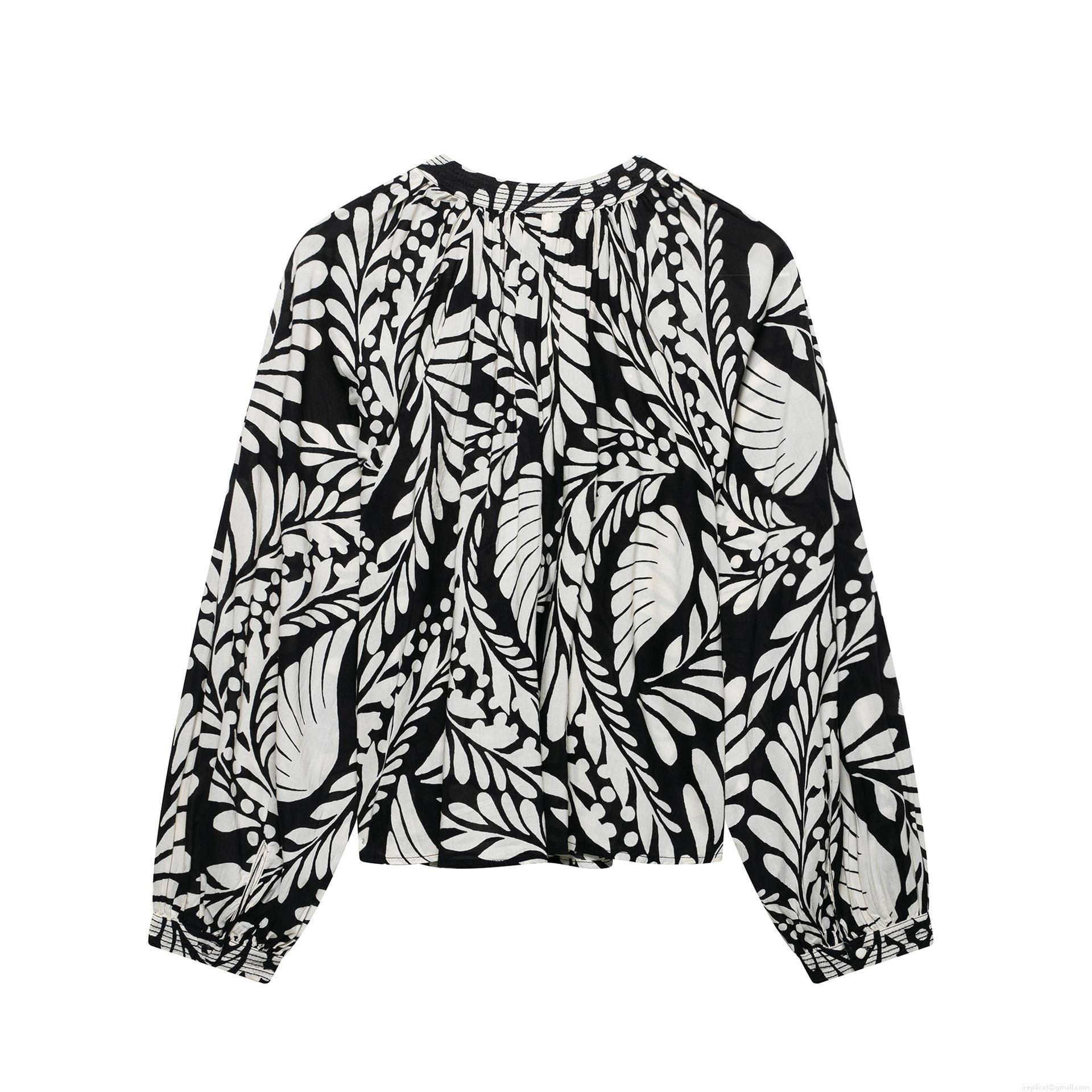 Women's Casual Black White Plant Leaf Print Two Piece Set Long Sleeve Round Neck Shirt And High Waist A-Line Midi Skirt Elegant Streetwear Outfit