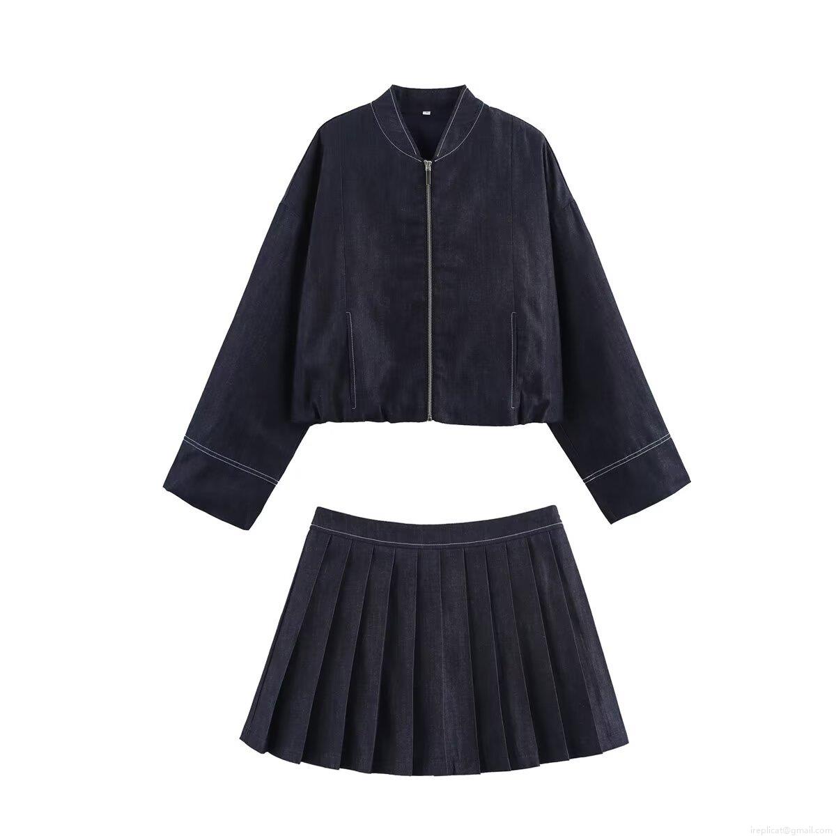 • Women's Casual Denim Jacket and Pleated Mini Skirt Set Contrast Stitching Zip Up Bomber Jacket High Waist A-Line Skirt Streetwear Two Piece Outfit Outwear