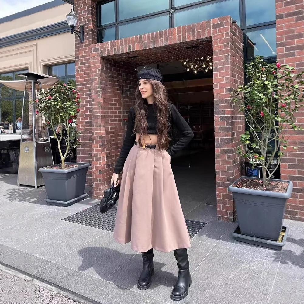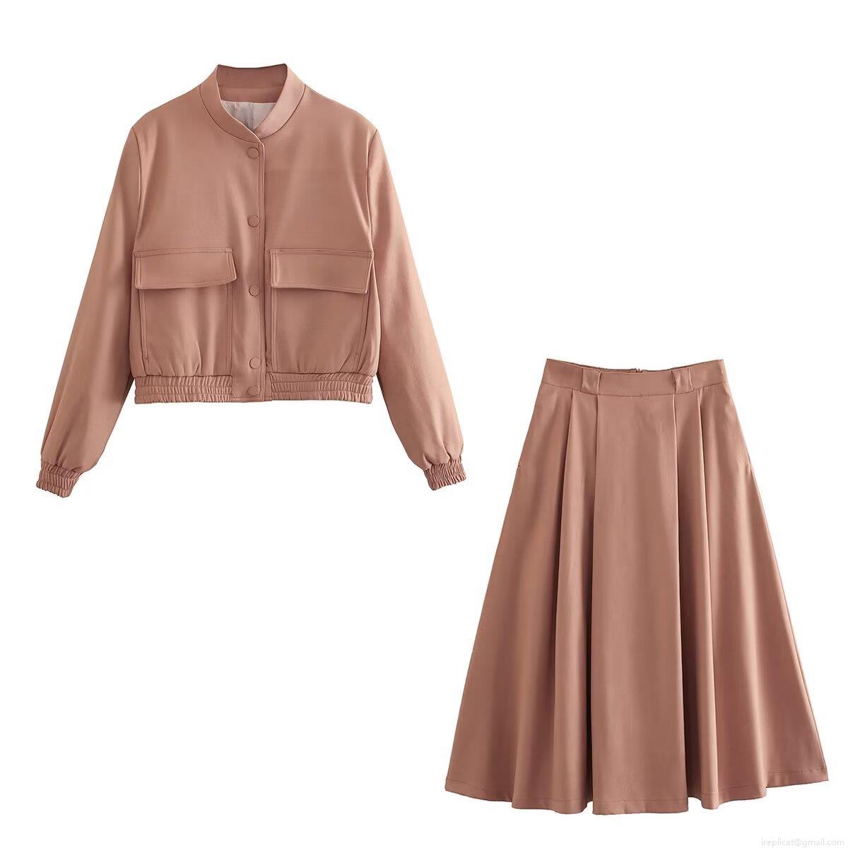 • Women's Casual Dusty Rose Two Piece Set Woven Polyester Short Stand Collar Pocket Flight Jacket and High Waist Pleated Midi Skirt Street Style Outfit