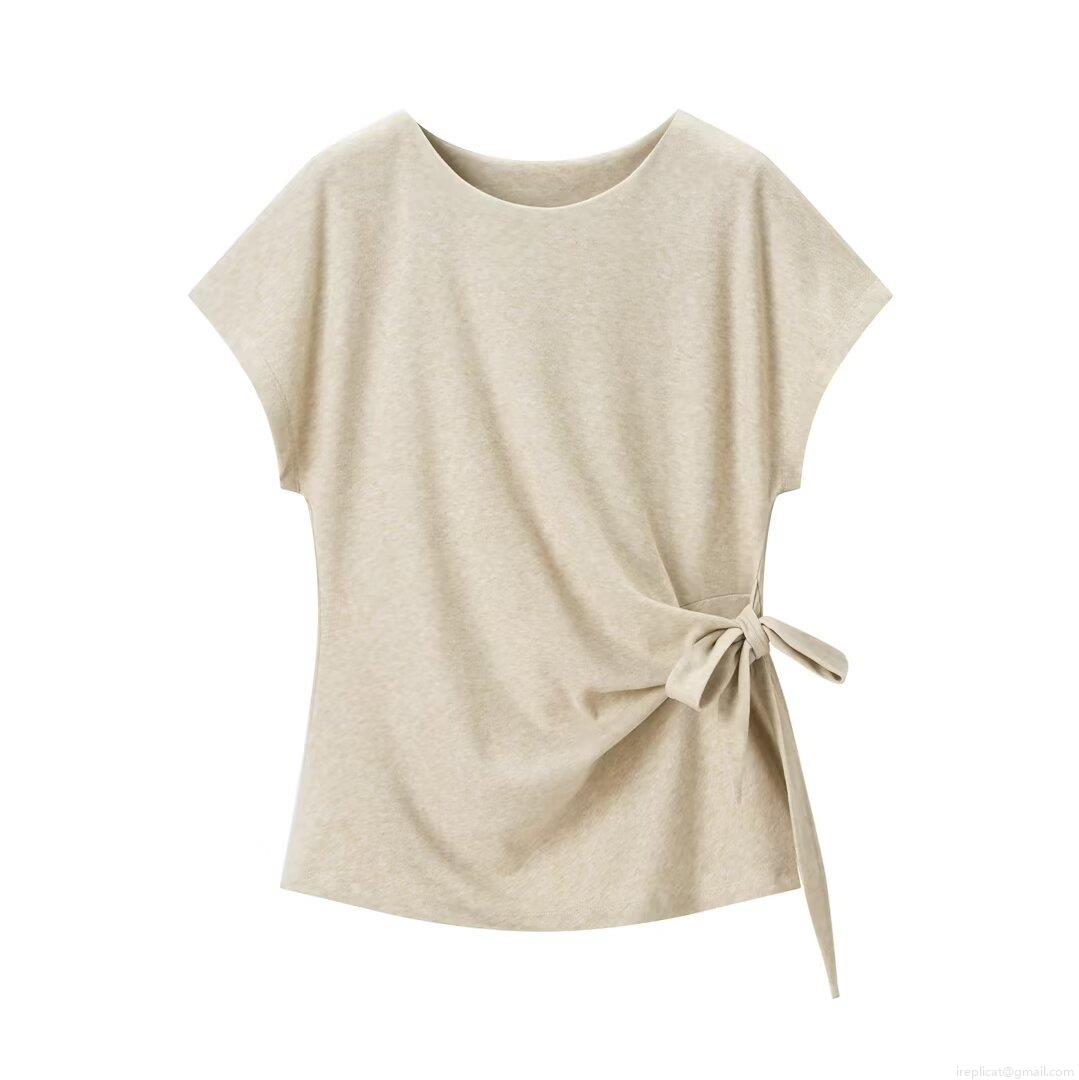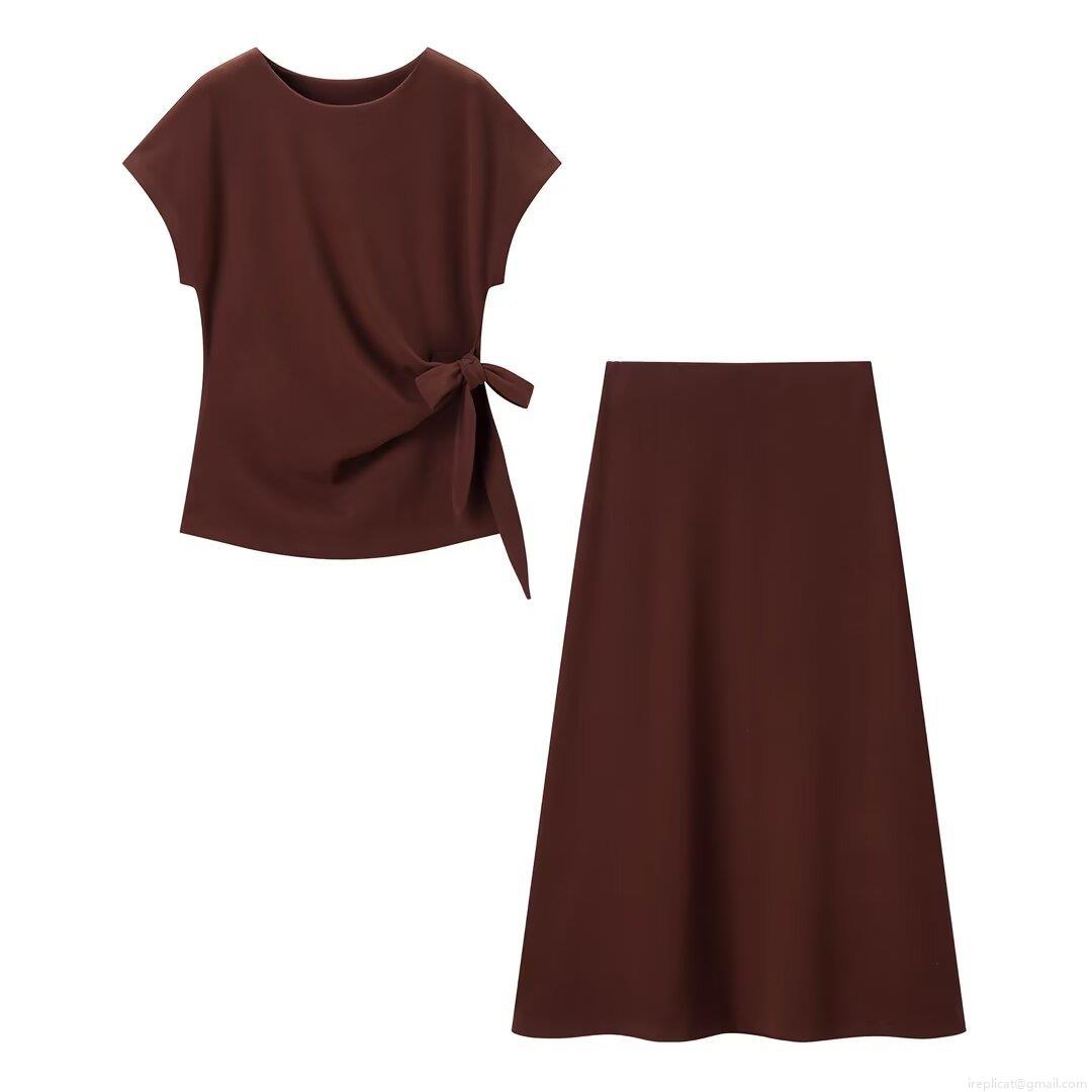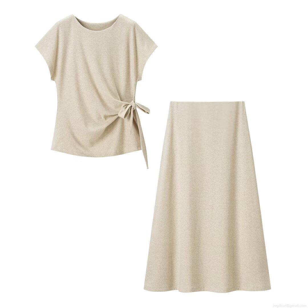 • Women's Casual Knit Two Piece Skirt Set Short Sleeve Round Neck Side Tie Top and High Waist A-Line Midi Skirt Solid Color Vacation Outfit